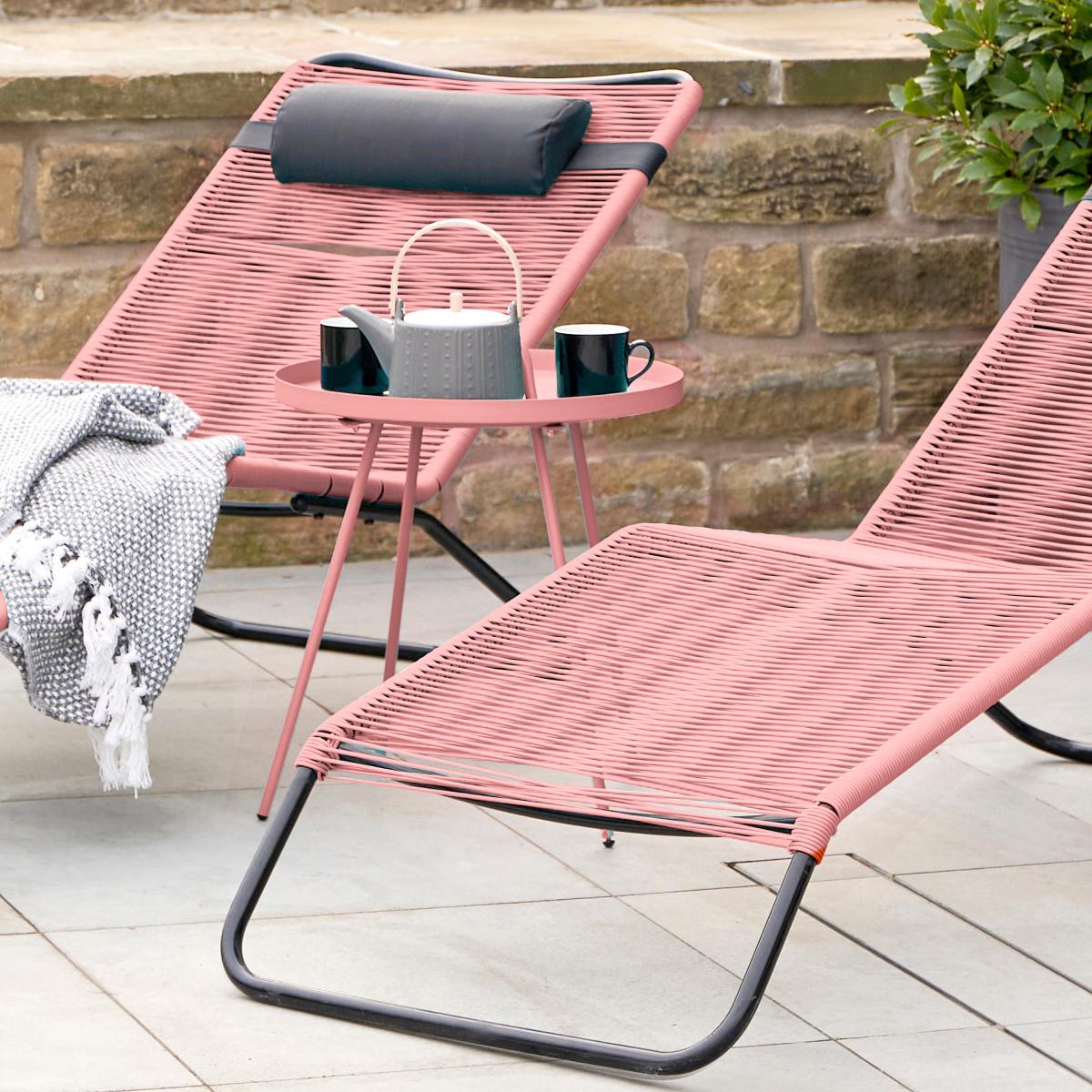 I love this pink steel table for its vibrant colour and sleek, modern design. It’s a great addition to outdoor spaces that want a pop of colour, especially in contemporary or transitional gardens. It works well with neutral-toned loungers or rattan furniture, adding a lively contrast without overpowering the overall aesthetic. Practical styling tips include pairing it with lightweight cushions, colourful throws, or even small potted plants to create a relaxed, inviting vibe. It’s a versatile piece that can double as a side table or a small table for drinks and snacks, making it ideal for family gatherings or alfresco socialising.