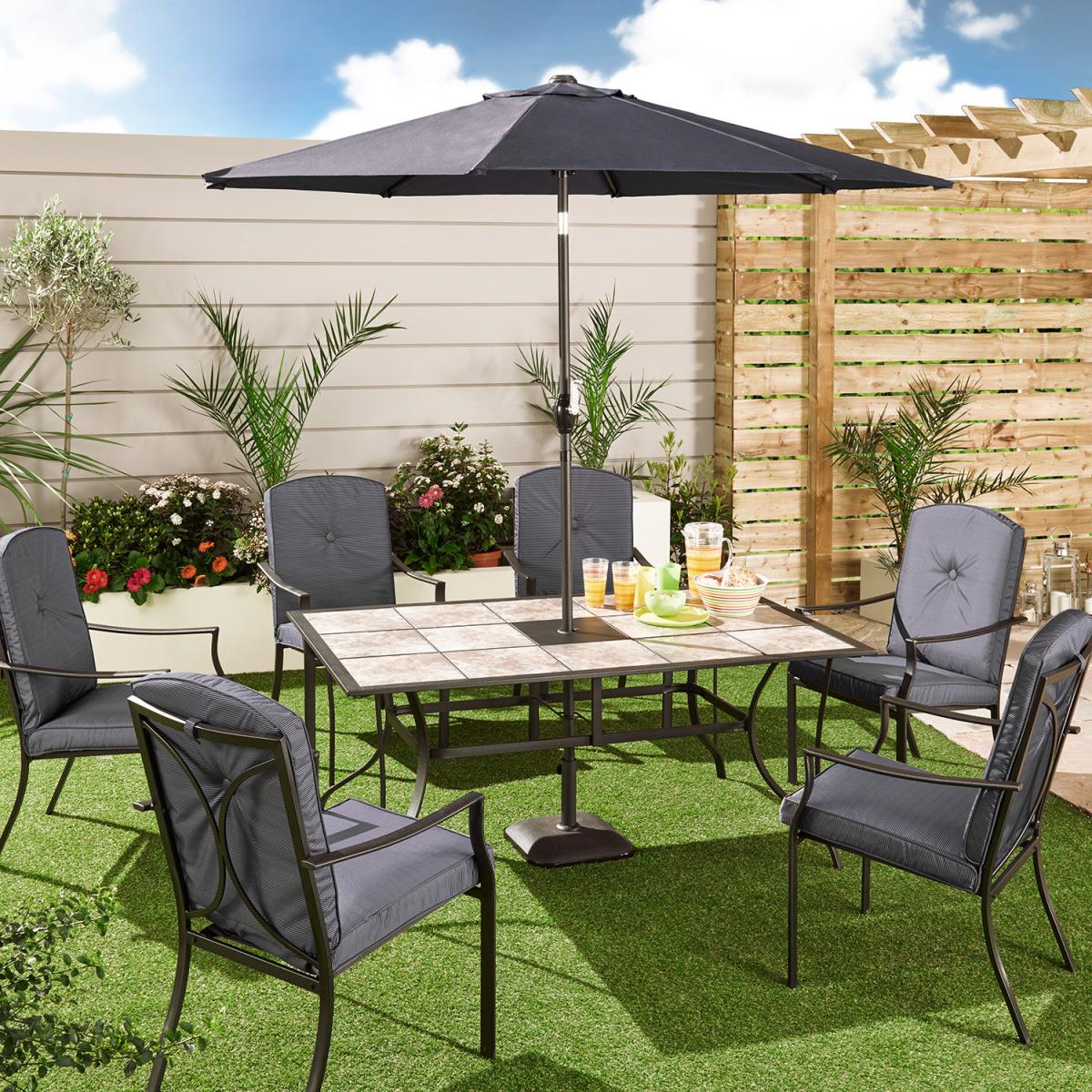 I’m a fan of the Rio tile top table because its ceramic-effect tiles add pattern without feeling fussy, and the slim black frame keeps it looking fresh season after season. It works equally well in a modern city balcony, a laid-back Mediterranean-style courtyard or a more rustic garden setting. For styling, lean into texture: group simple terracotta pots or a metal tray of herbs at the centre and thread an umbrella through the built-in hole for extra shade. Pair with cushions or seat pads in muted greens or warm ochres to tie in with planting, and layer with a neutral table runner when you’re serving up brunch or evening drinks.