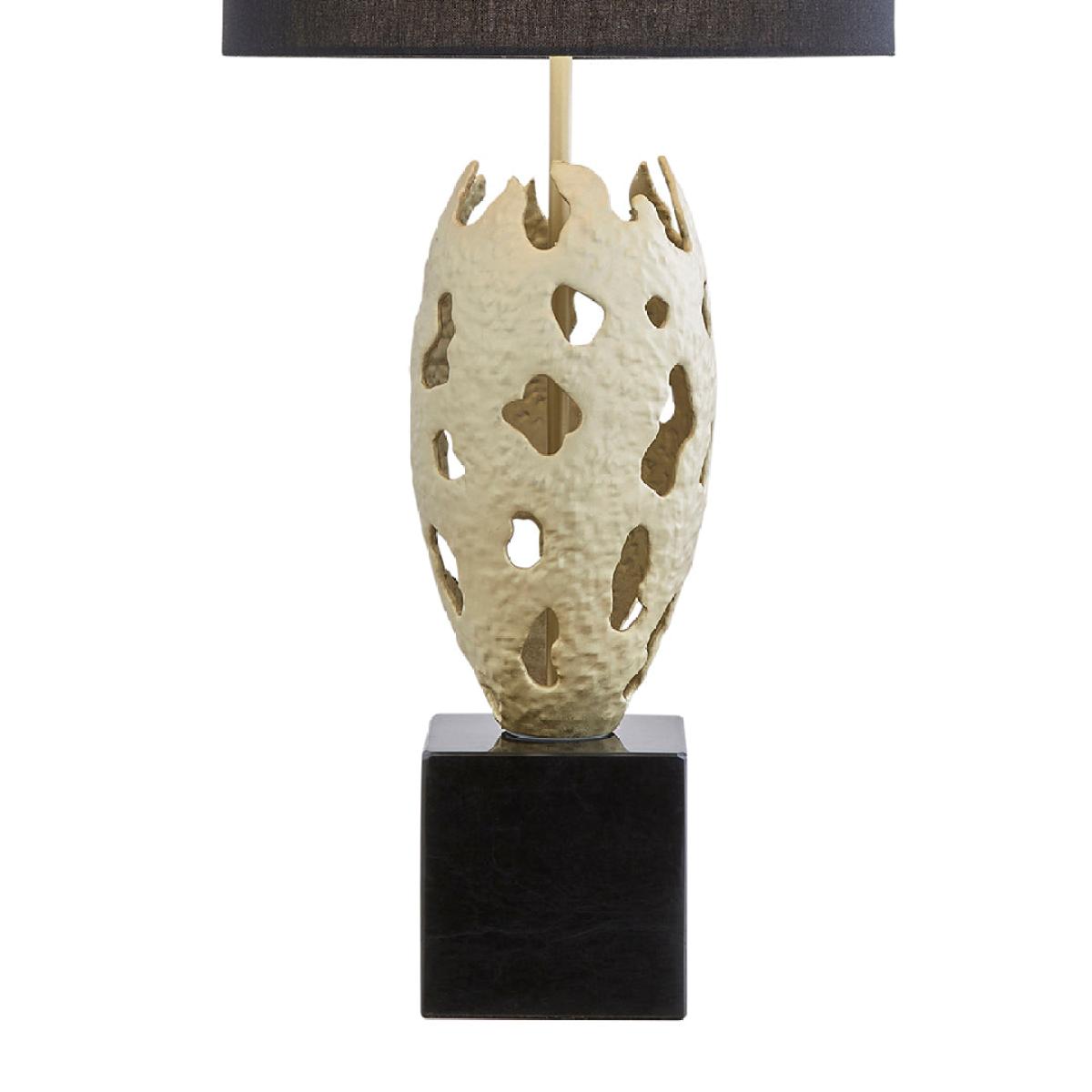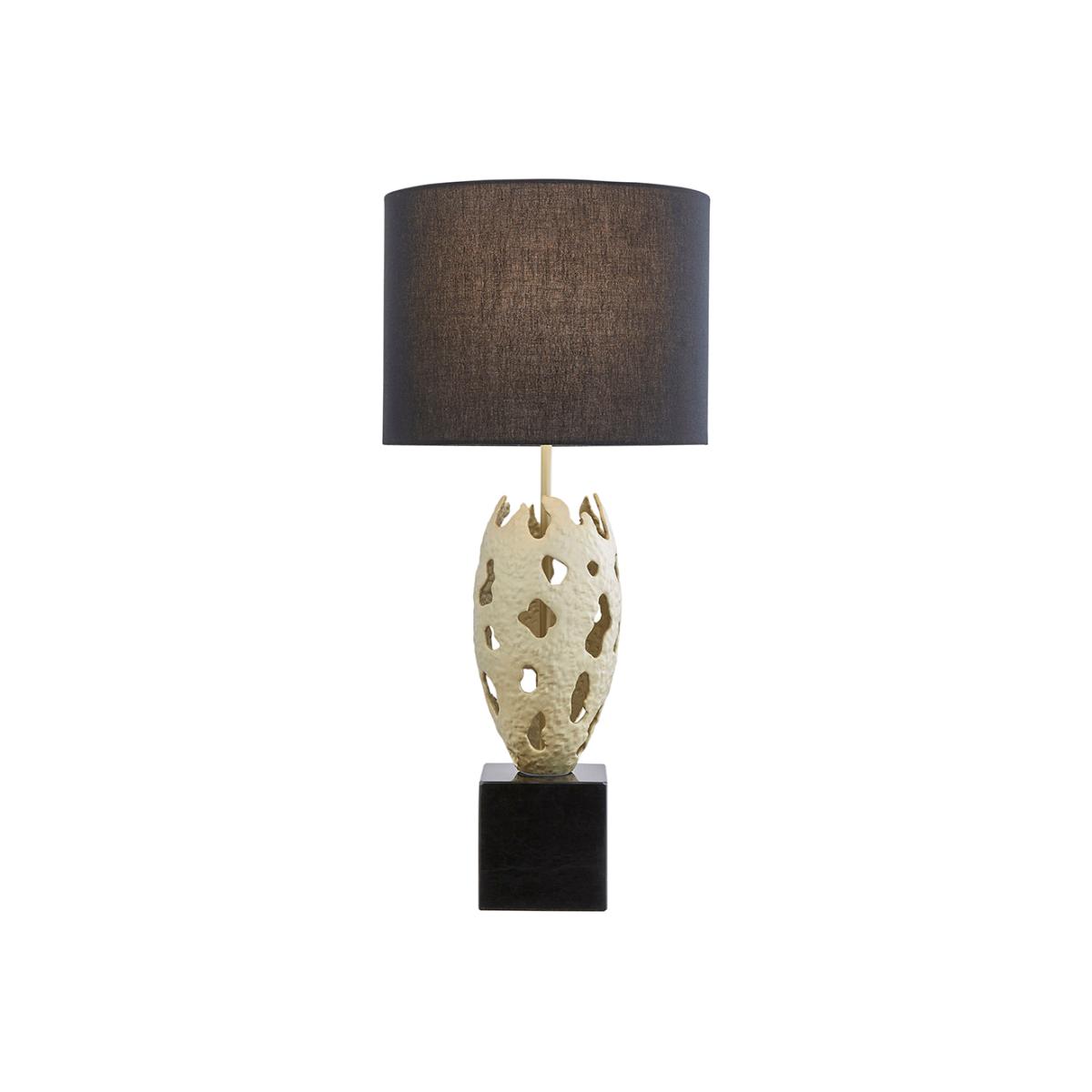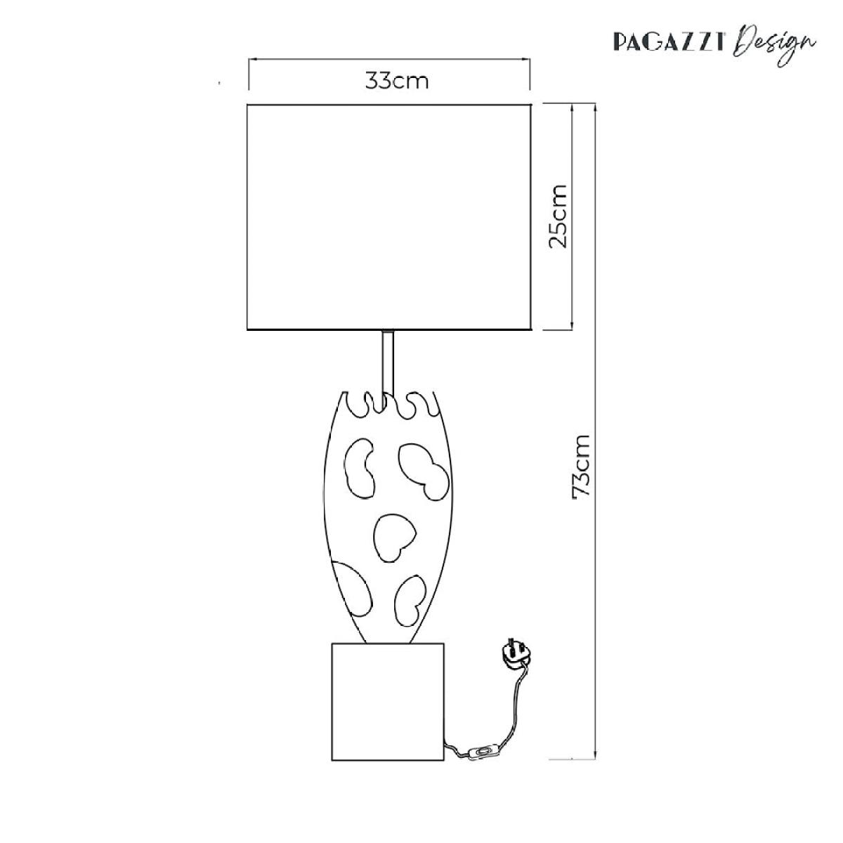 Make a bold statement in your home with the Riona Metallic Gold Table Lamp, a dramatic and luxurious Pagazzi Lighting exclusive designed to captivate attention. Oversized yet elegant, this lamp is crafted from a sophisticated blend of stacked components, giving it impressive height without overwhelming visual volume—a perfect choice for tighter spaces that still deserve impact. Product dimensions: H73xDia3. 3 cm Requires 1x ES27 light bulb In-line switch At its centre sits a textured metallic gold goblet-shaped body, artistically sculpted with organic cut-out detailing that adds depth and intrigue. This sculptural feature is elevated on a polished black square plinth, which showcases subtle marbling to enhance its refined finish. The contrast between soft gold and deep black creates a rich, opulent aesthetic. Topped with a black textured fabric cylinder shade, the Riona lamp brings an atmospheric glow and a sense of decadent sophistication to any room. Whether placed on a console, sideboard or positioned neatly in a corner, this piece will certainly not go unnoticed. Due to its substantial construction, please note that this is a heavy item.
