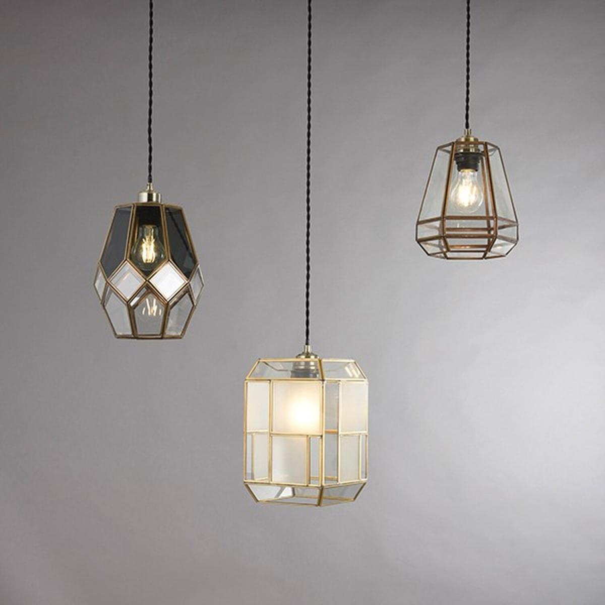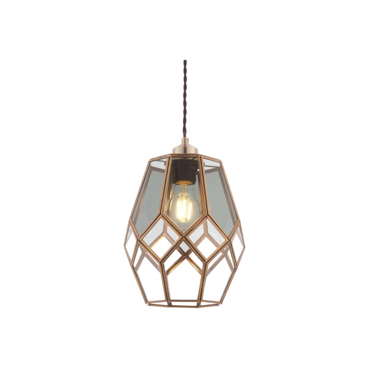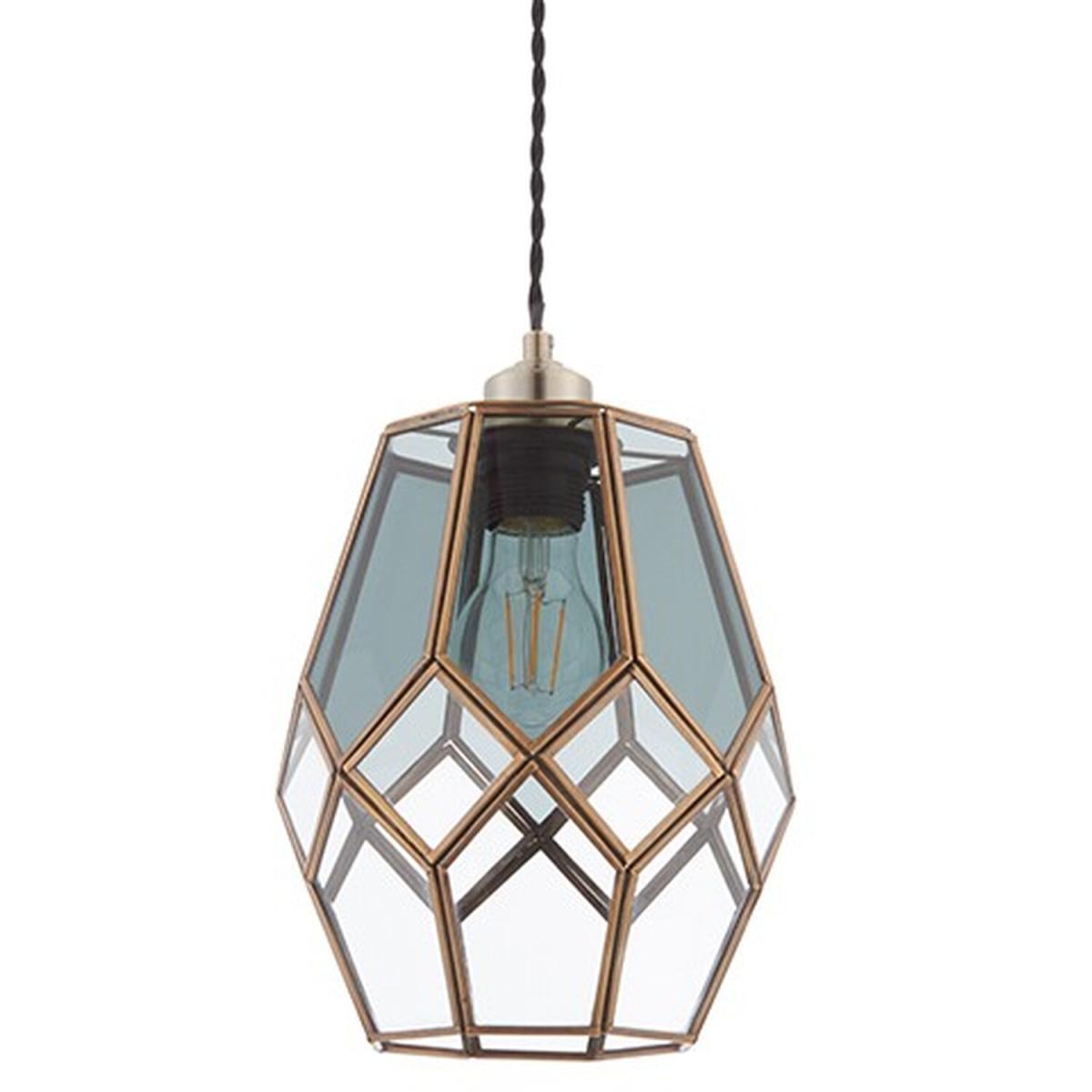 The is a glass cage pendant with clear and grey glass panels, finished with an antique brass effect trim. This is a non elec pendant and should be teamed with a cable set. Compatible with LED lamps.