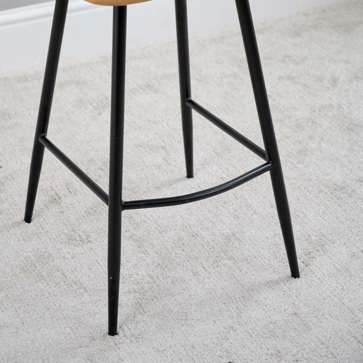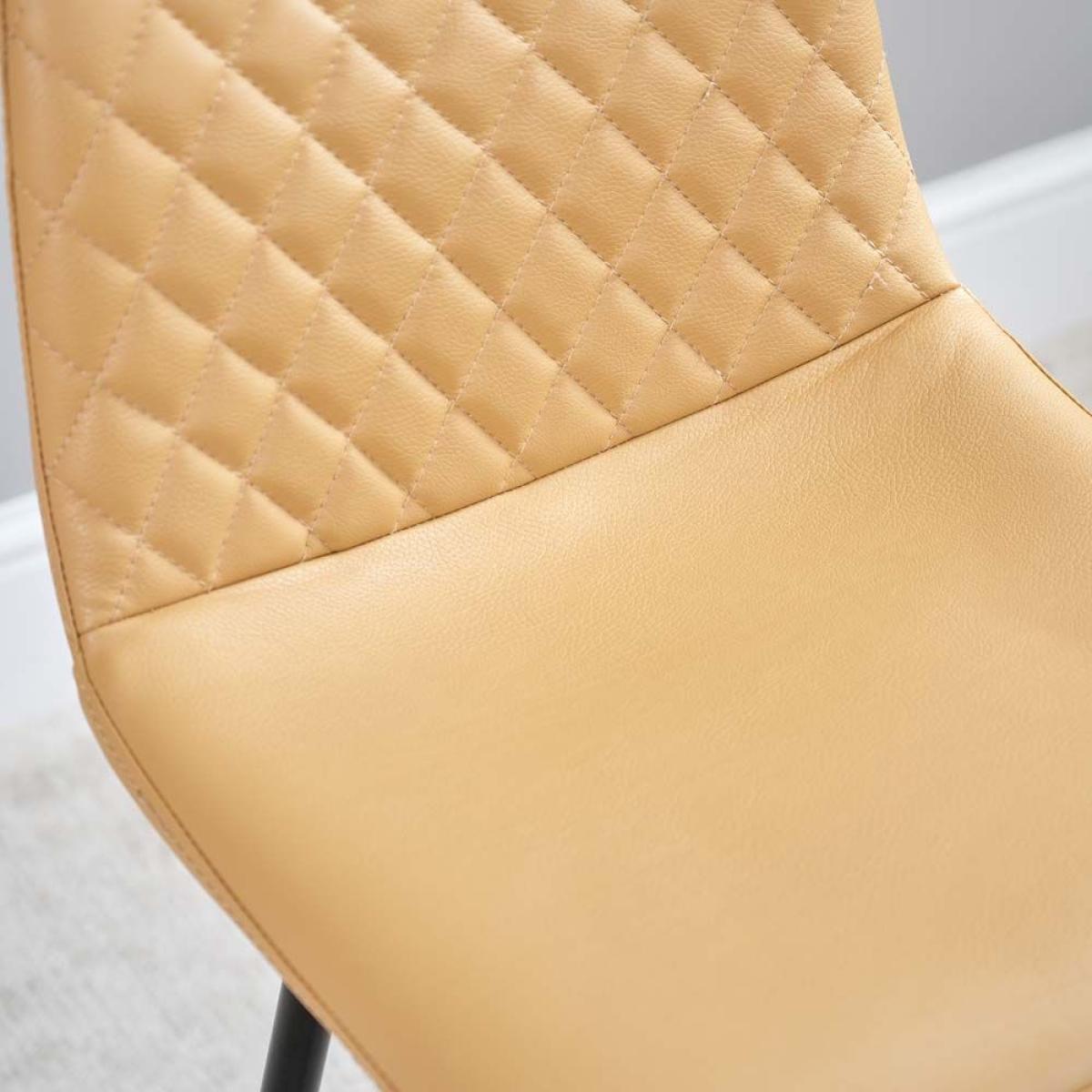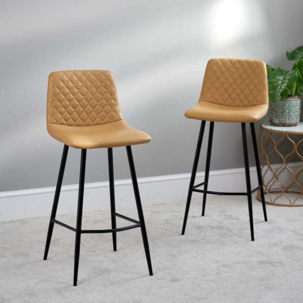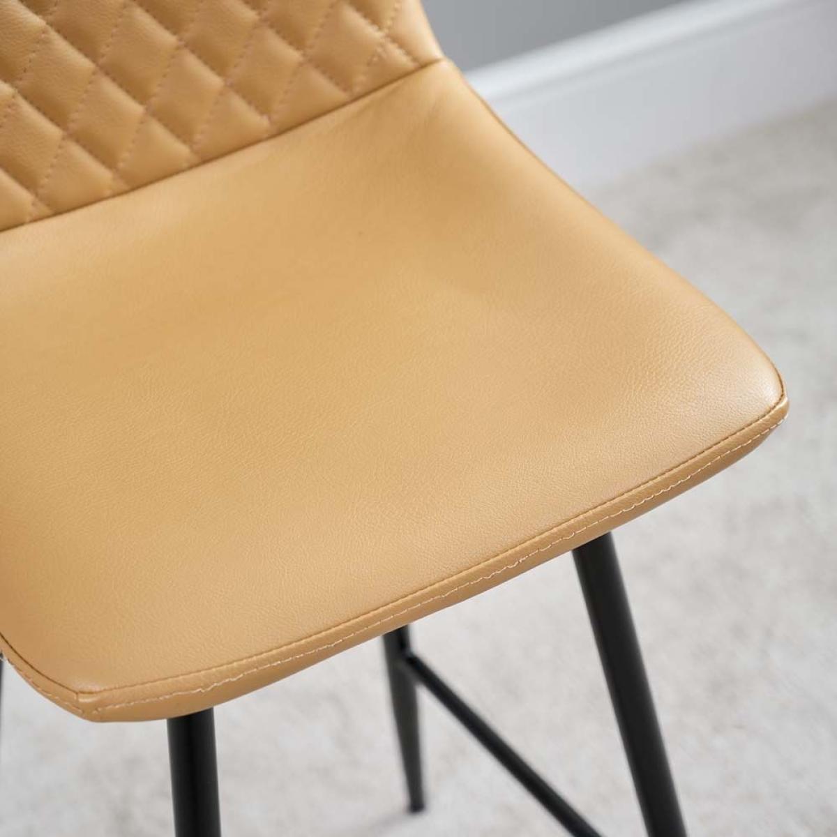 Upholstered in a warm mustard faux leather with a diamond quilted back and smooth seat, the Ripley bar stool makes a modern addition for your breakfast bar or bar table. Complete with four angled black metal legs for stability with a horizontal bar part way down to rest your feet on. Also available in a wide selection of other colours. W43.5cm x D37.5cm x H105cm Fabric samples available on request. Sold as a pair. Simple self assembly