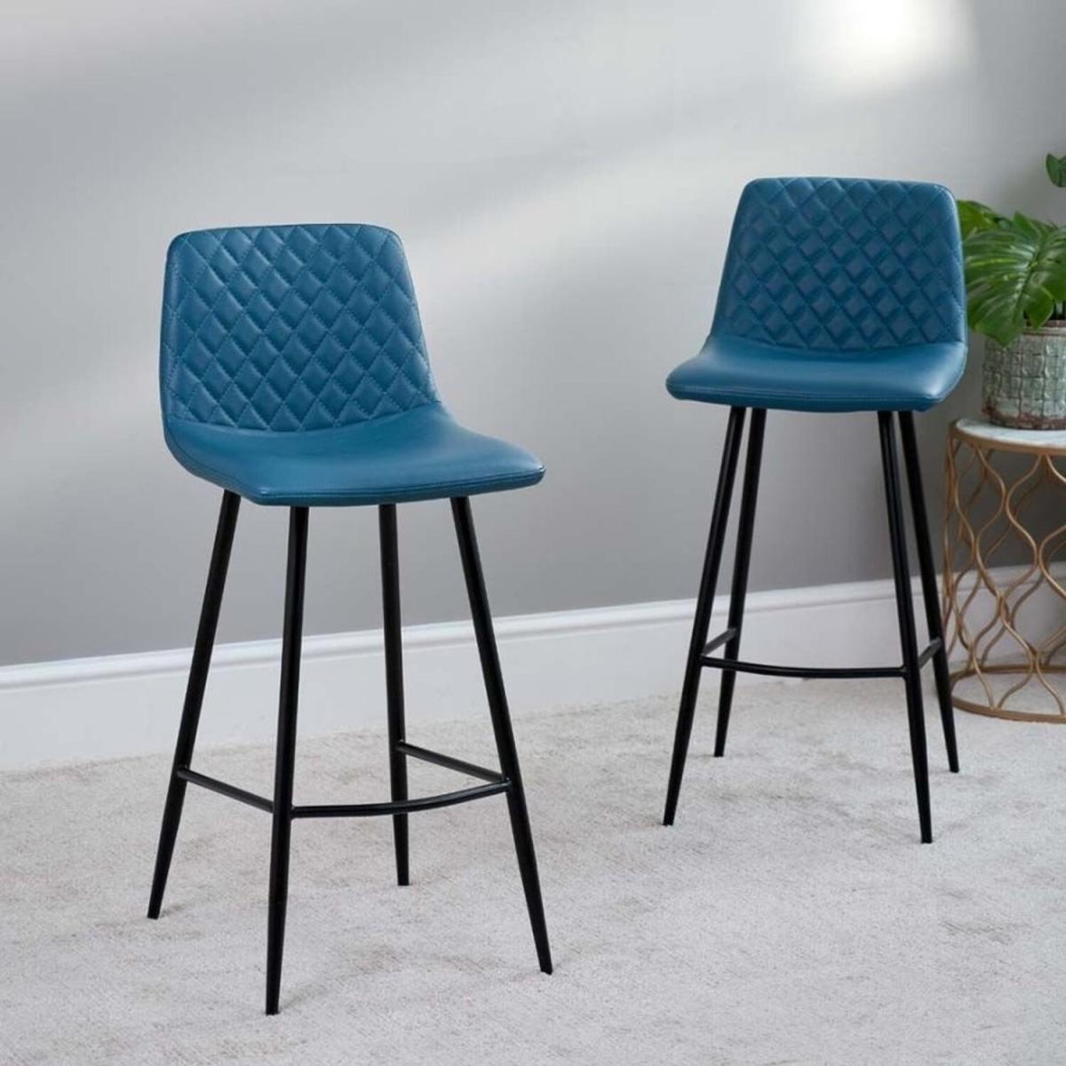 Take a seat on one of our colourful Ripley bar stools. They feature a faux leather upholstery with a diamond quilted chair back and smooth seat on top of four black strong metal legs which have a horizontal bar part way down to rest your feet on. Also available in a wide selection of other colours.