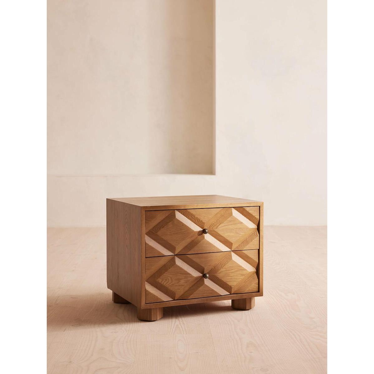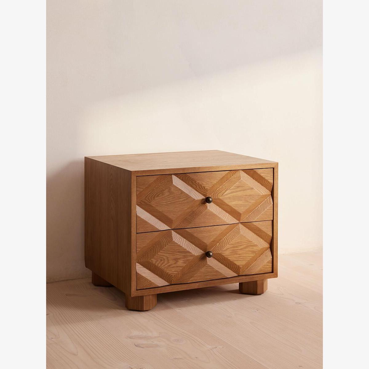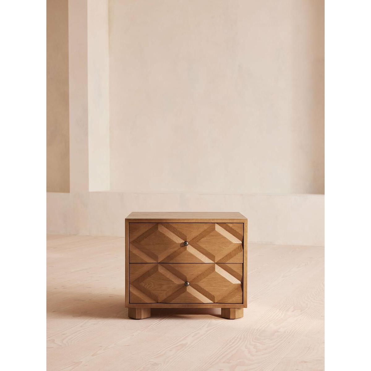 Referencing the furniture seen throughout Soho House Tel Aviv, Jaffa, the Ripley bedside table is made from solid oak and veneer with a mid-tone finish. Diamond machined-carved drawer fronts and blackened brass handles bring a traditional quality to the piece, while structured, solid oak stump legs add a contemporary touch. Pair with other items from the Ripley collection to echo the bedrooms in the House's turreted building. Two-drawer bedside table Mid-tone finish Low and wide form Diamond machined-carved drawer fronts Blackened brass handles Solid oak stump legs Spacious interior Inspired by Soho House Tel Aviv, Jaffa