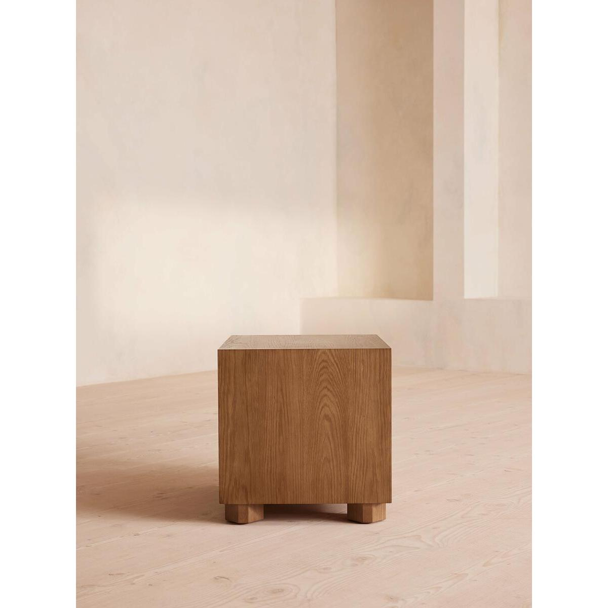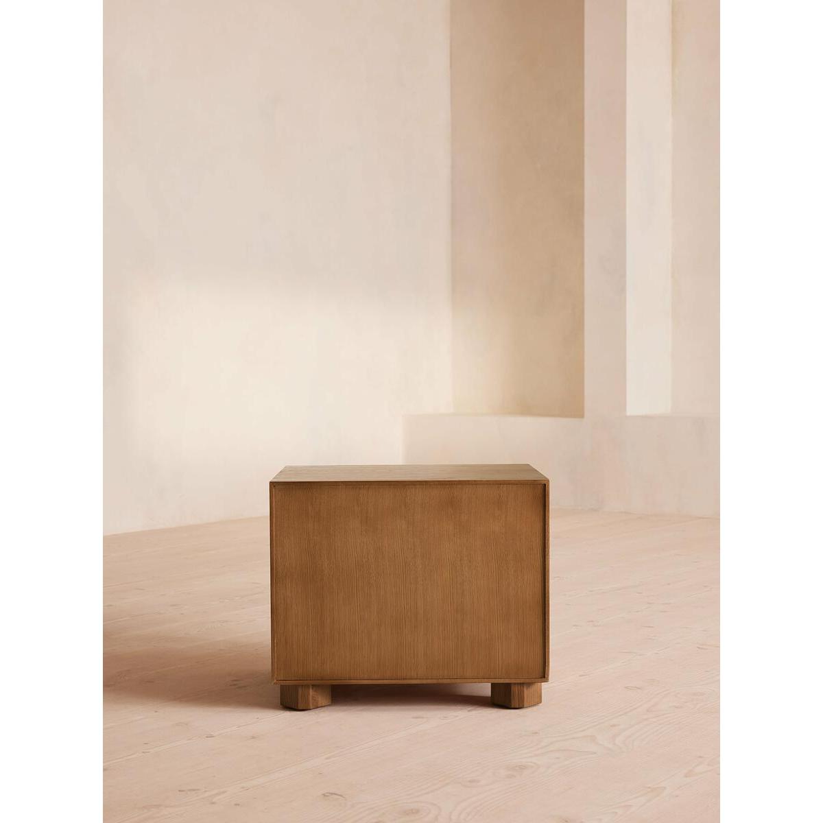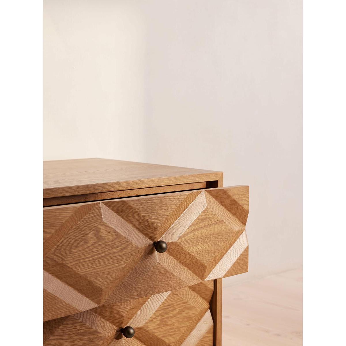 Referencing the furniture seen throughout Soho House Tel Aviv, Jaffa, the Ripley bedside table is made from solid oak and veneer with a mid-tone finish. Diamond machined-carved drawer fronts and blackened brass handles bring a traditional quality to the piece, while structured, solid oak stump legs add a contemporary touch. Pair with other items from the Ripley collection to echo the bedrooms in the House's turreted building. Two-drawer bedside table Mid-tone finish Low and wide form Diamond machined-carved drawer fronts Blackened brass handles Solid oak stump legs Spacious interior Inspired by Soho House Tel Aviv, Jaffa