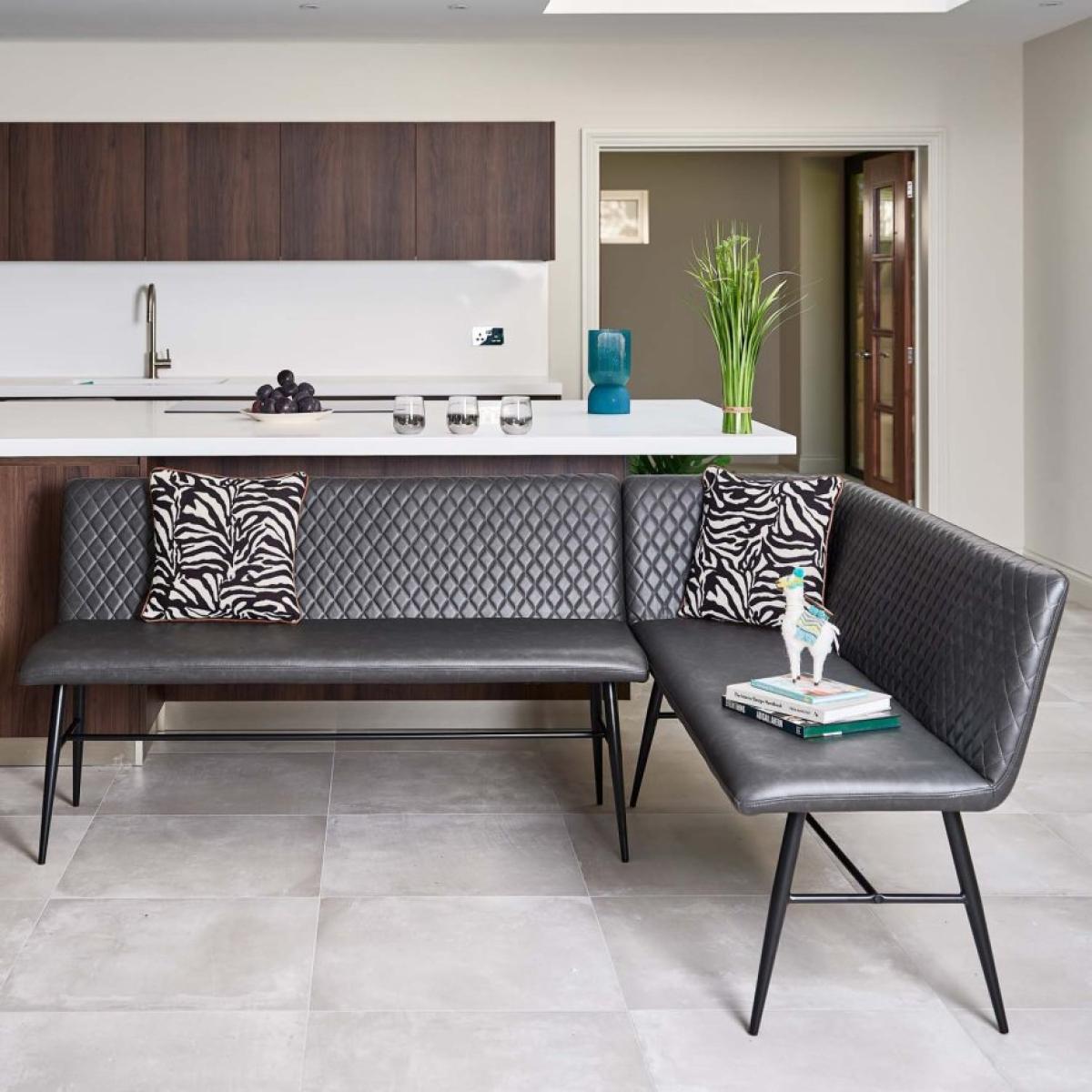 The Ripley Corner Bench in a sophisticated deep grey faux leather upholstery is a stylish addition to your dining area. The corner dining bench is made up of two interlinking sections, giving you plenty of seating around your table. The corner bench matches perfectly with the Ripley dining chair and low bench with no back. This bench is also available in tan and in a right hand configuration.. *Faux leather upholstery *Also available in tan * Right hand facing also available *DimensionsTB C
