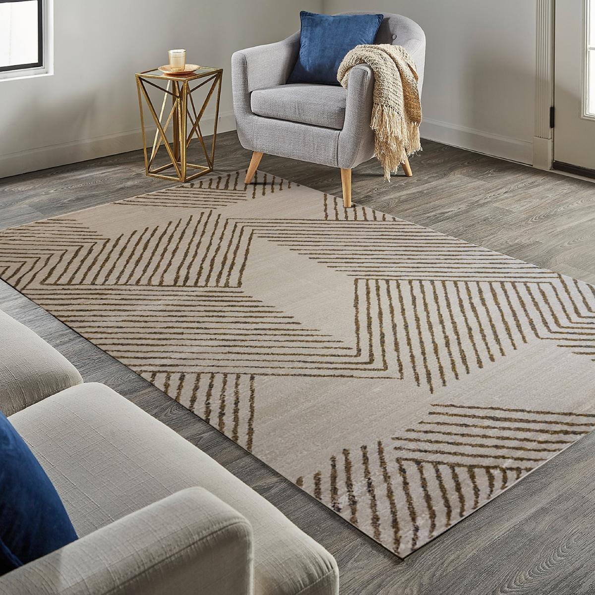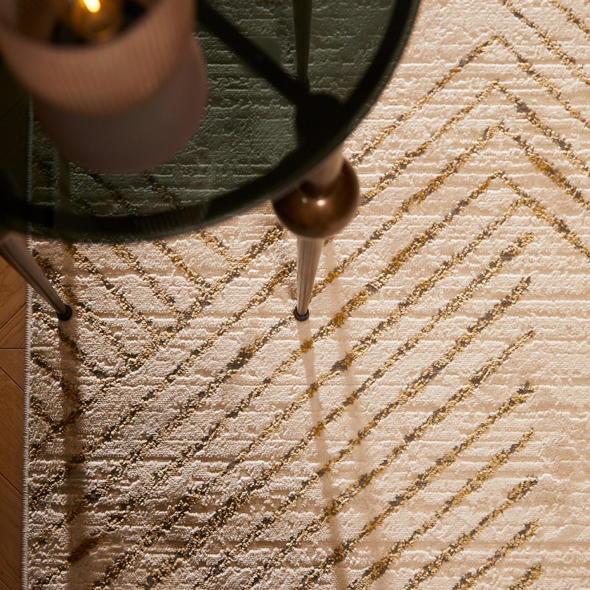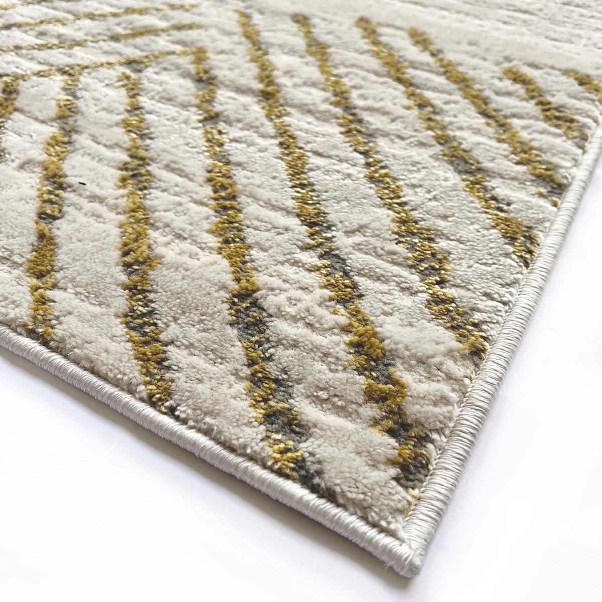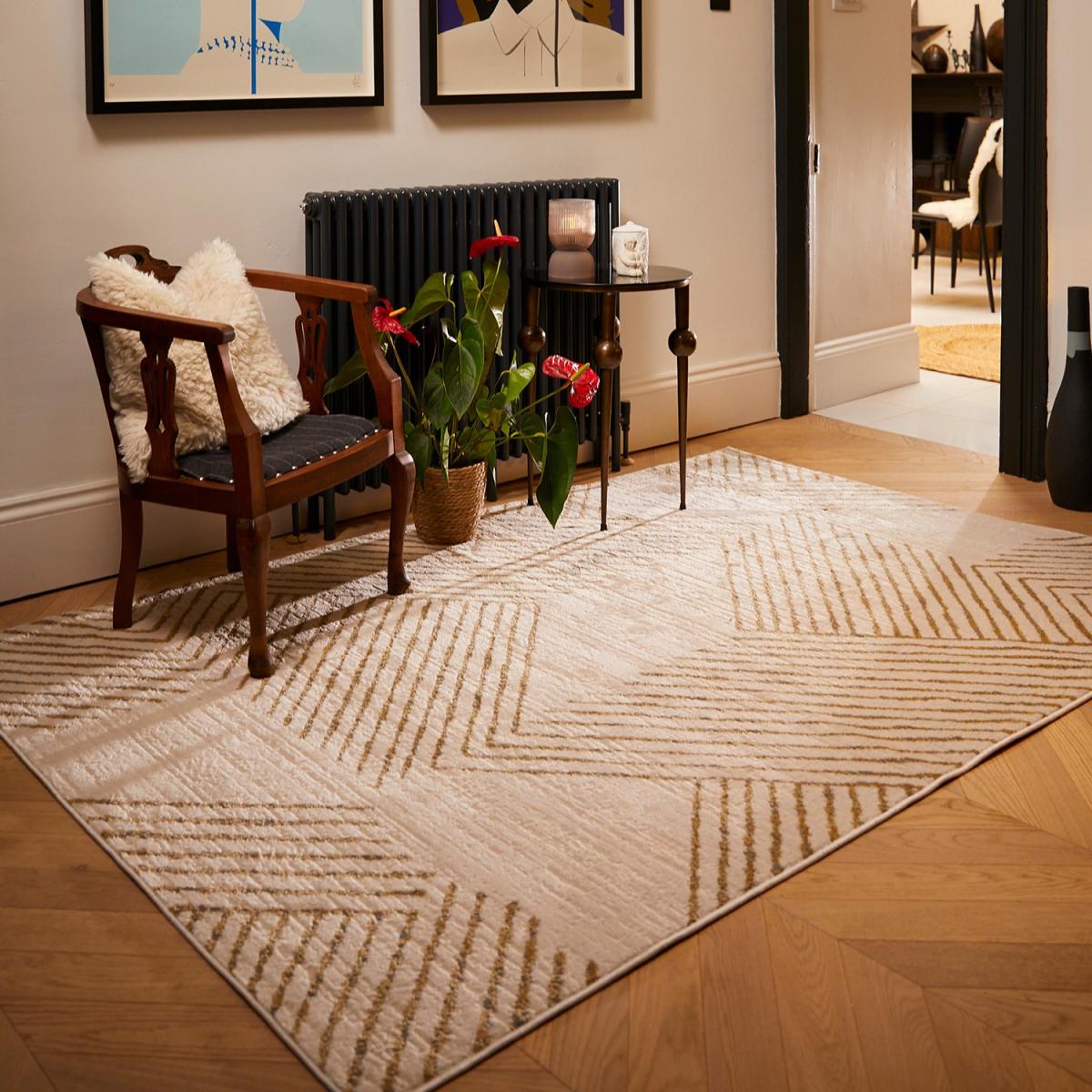 Dimensions:H:230 x W:160cm Delta ivory rug is the perfect simple chic look with its abstract geometric design and pops of gold and grey. Made form polypropylene and polyester, this rug is both easy care and beautifully soft. Effortlessly style in so many rooms from living space to dining room to bedroom. Vacuum/spot clean only. Don't use beater bar. Professional cleaning recommended. Features: abstract geometric design and pops of gold and grey Professional cleaning recommended. 85% Polypropylene, 15% Polyester