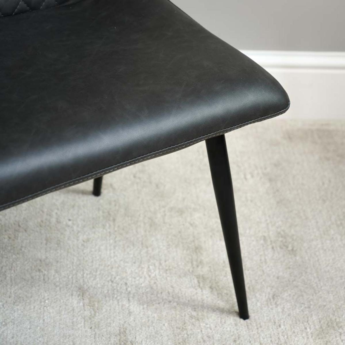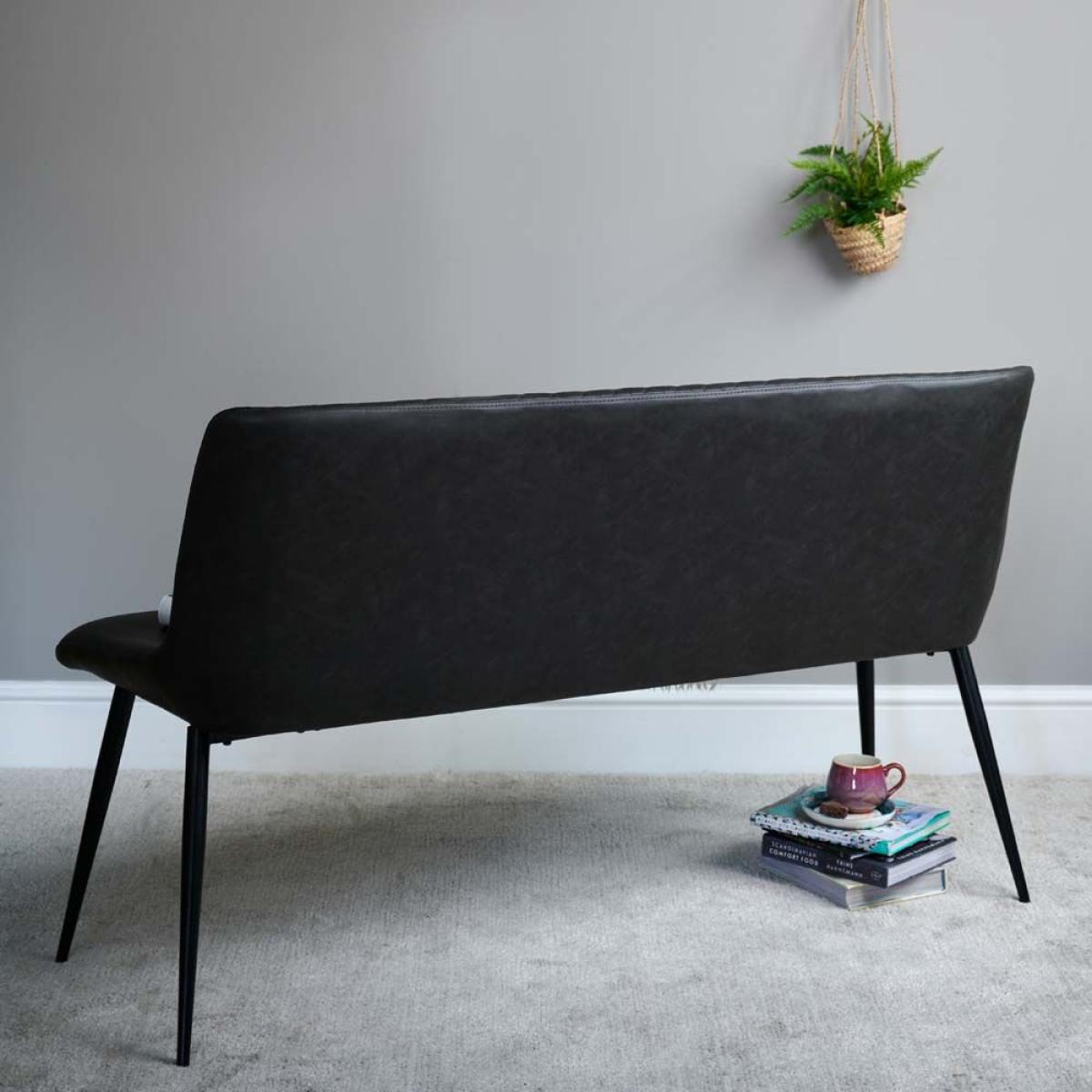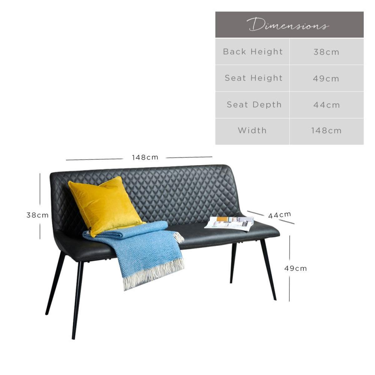 The Ripley upholstered bench with back is a great alternative to our Ripley Dining Chairs, and easily sits two or three if you like being cosy. Dining Benches are becoming more and more popular for that sociable dining feel in your own home, and are great space savers as you can slide along the bench rather than pulling out the table further into the room. The Ripley dining bench is upholstered in dark grey faux leather and is supported by four powder coated black metal legs. Faux leather upholstery. Powder Coated Black Metal legsDimensions:W148cm x H87cm x D44cm - Seat Height: 49cm. Fabric samples available on request. Simple self assembly