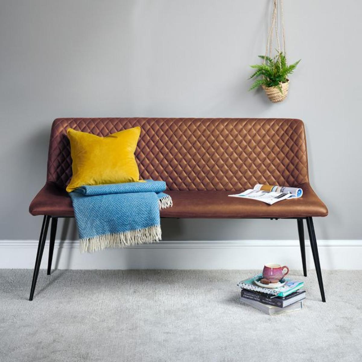 The modern style of our signature Ripley range of stools and chairs is now available in this perfectly practical upholstered bench with back. Swathed in a tactile tan faux leather, comfortable and supportive, the Ripley dining bench is a great alternative to traditional chairs and gives a more sociable feel to the dining experience. Tapered powder-coated black metal legs. Faxu Leather upholstery with diamon stitch back. Dimensions: W148cm D44cm H87cm - Seat Height: 49cm. Simple self assembly
