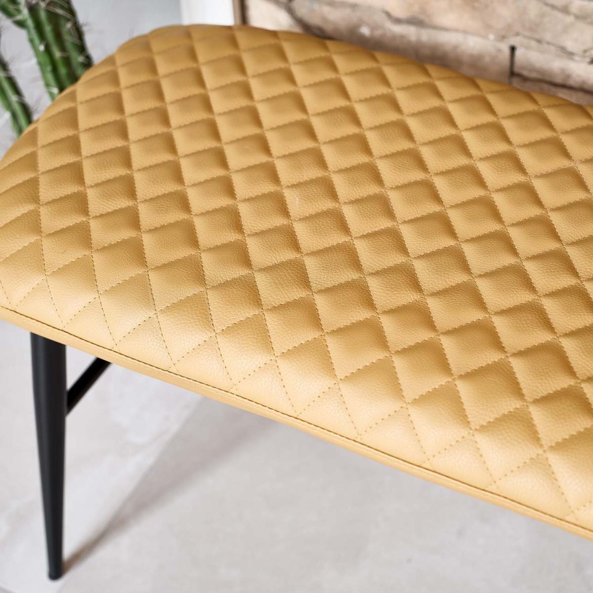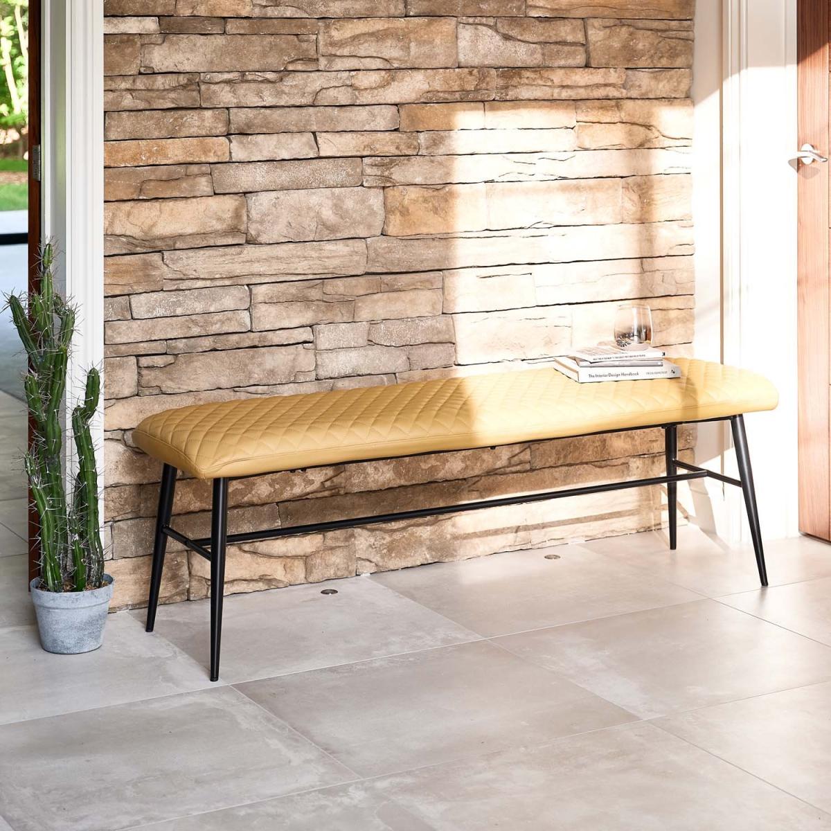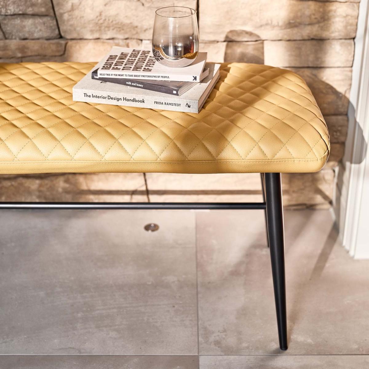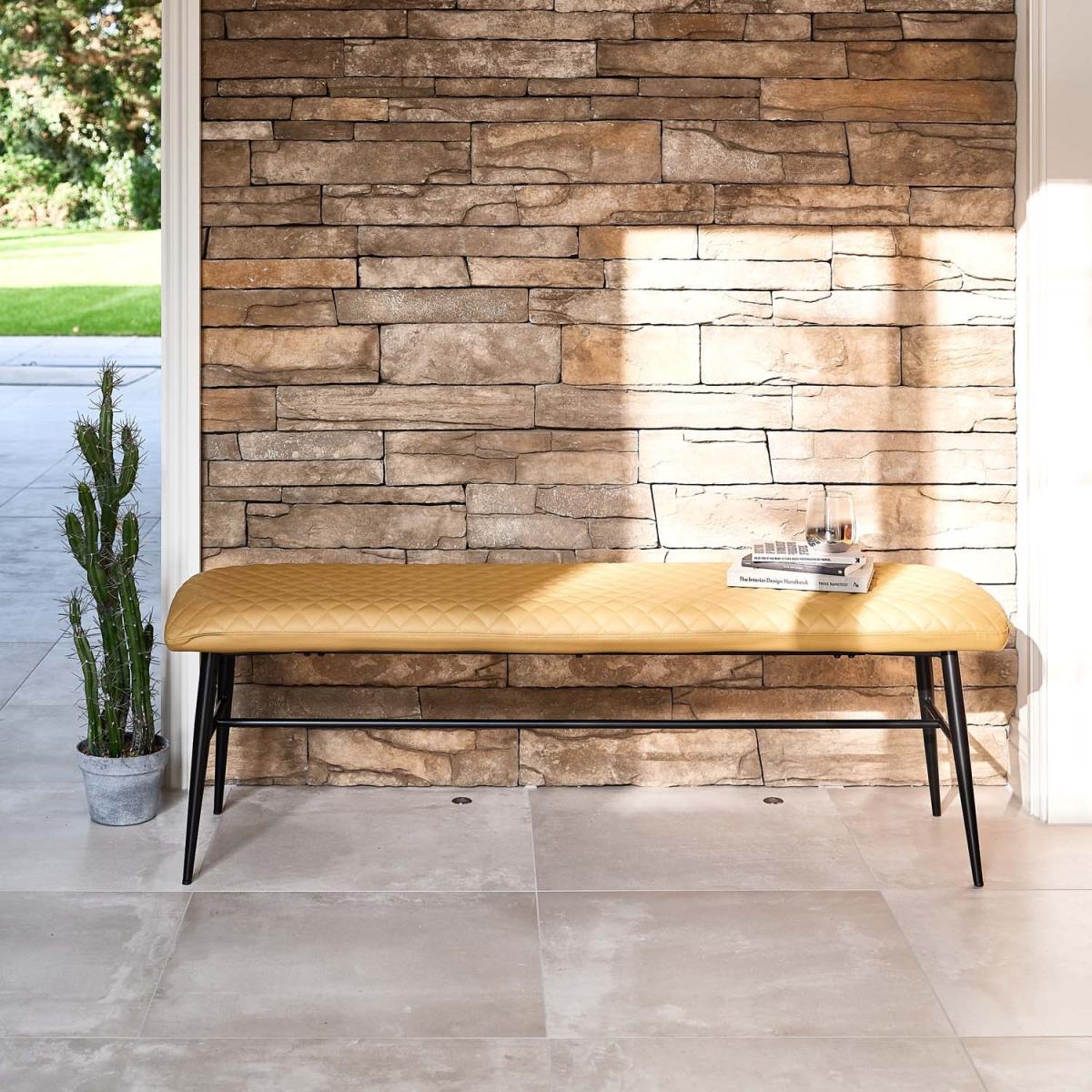 The Ripley Flat Bench is a great addition to our incredibly popular Ripley range and sits perfectly with the Ripley Dining chairs around your dining table. The bench is upholstered in a diamond stitched soft faux leather, which is available in four great colours; a classic tan and simple grey, plus more accent tones of teal and mustard. The bench is supported by tapered black powder coated metal legs and bolstered with a cross bar for extra sturdiness. Using dining benches as a seating option allow for a more communa feel during gatherings around the table, and are a great way to maximise available space.