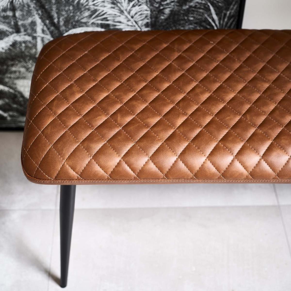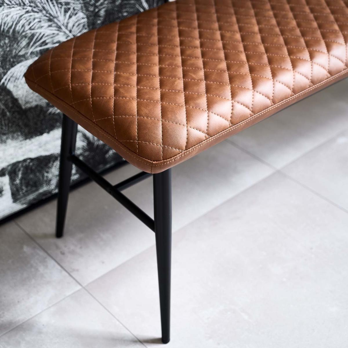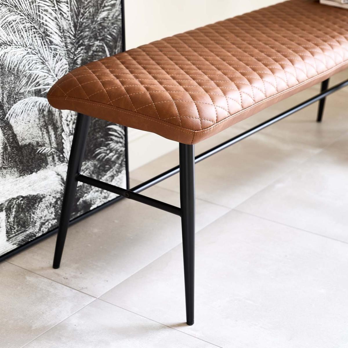 The Ripley Flat Bench is a great addition to our incredibly popular Ripley range and sits perfectly with the Ripley Dining chairs around your dining table. The bench is upholstered in a diamond stitched soft faux leather, which is available in four great colours; a classic tan and simple grey, plus more accent tones of teal and mustard. The bench is supported by tapered black powder coated metal legs and bolstered with a cross bar for extra sturdiness. Using dining benches as a seating option allow for a more communa feel during gatherings around the table, and are a great way to maximise available space.