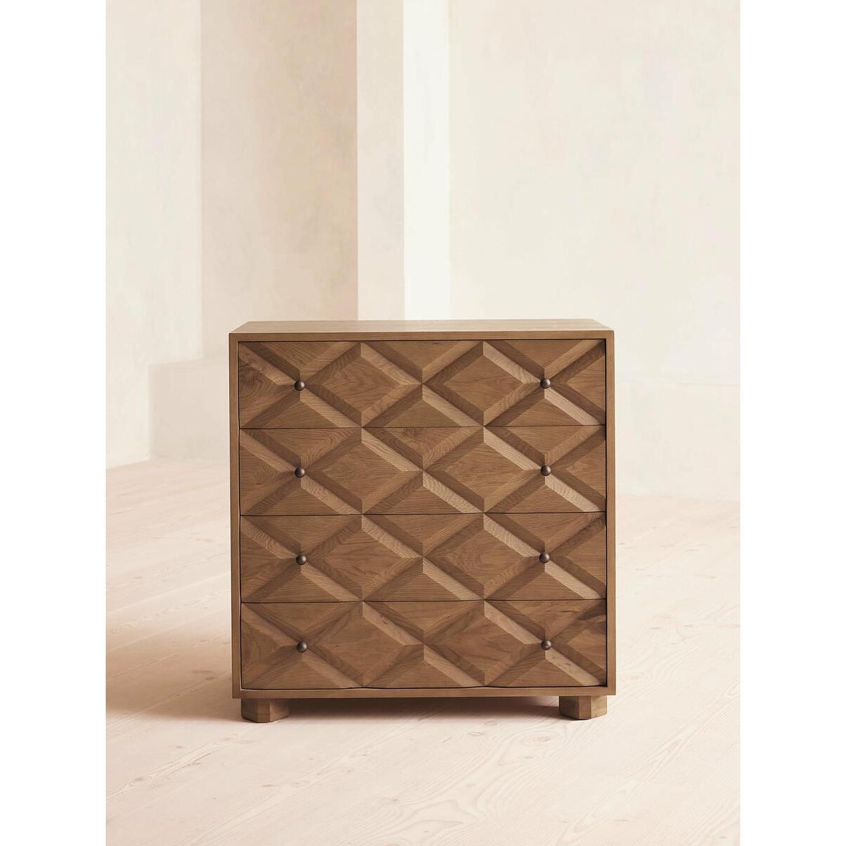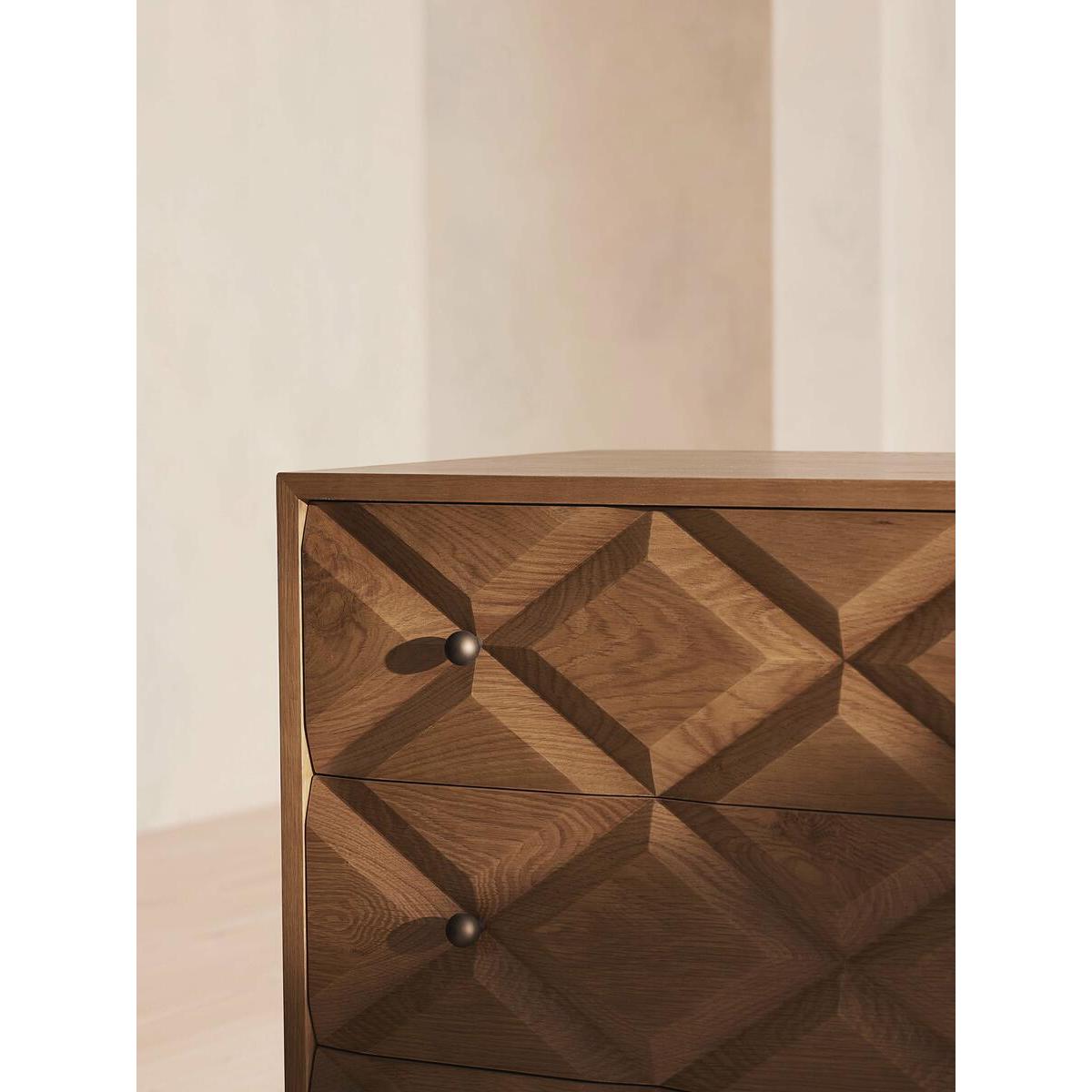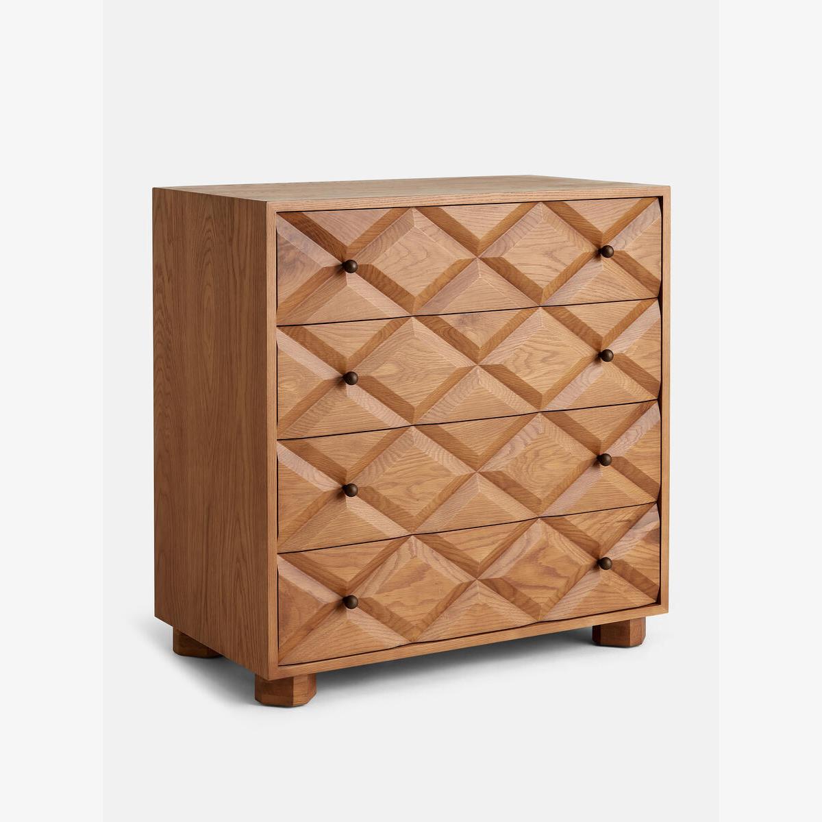 Referencing the furniture seen throughout Soho House Tel Aviv, Jaffa, the Ripley four-drawer dresser is made from solid oak and veneer with a mid-tone finish. Diamond machined-carved drawer fronts and blackened brass handles bring a traditional quality to the piece, while structured, solid oak stump legs add a contemporary touch. Pair with other items from the Ripley collection to echo the bedrooms in the House's turreted building. Four-drawer dresser Mid-tone finish Low and wide form Diamond machined-carved drawer fronts Blackened brass handles Solid oak stump legs Spacious interior Inspired by Soho House Tel Aviv, Jaffa