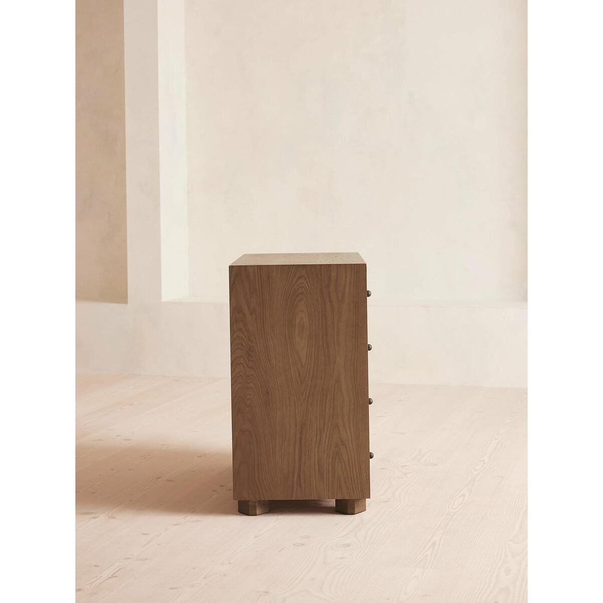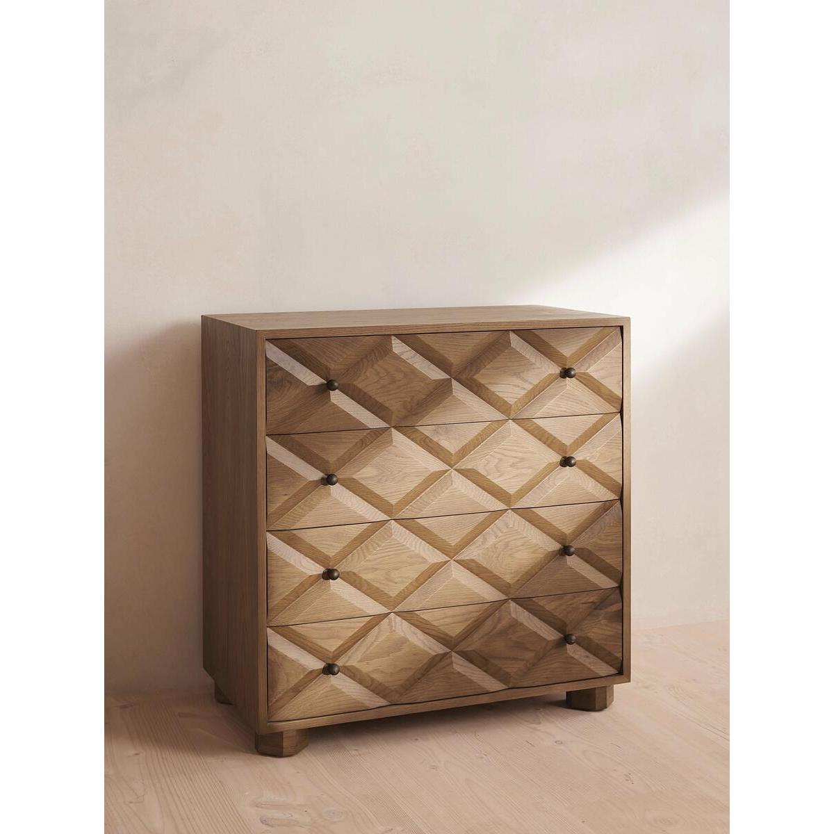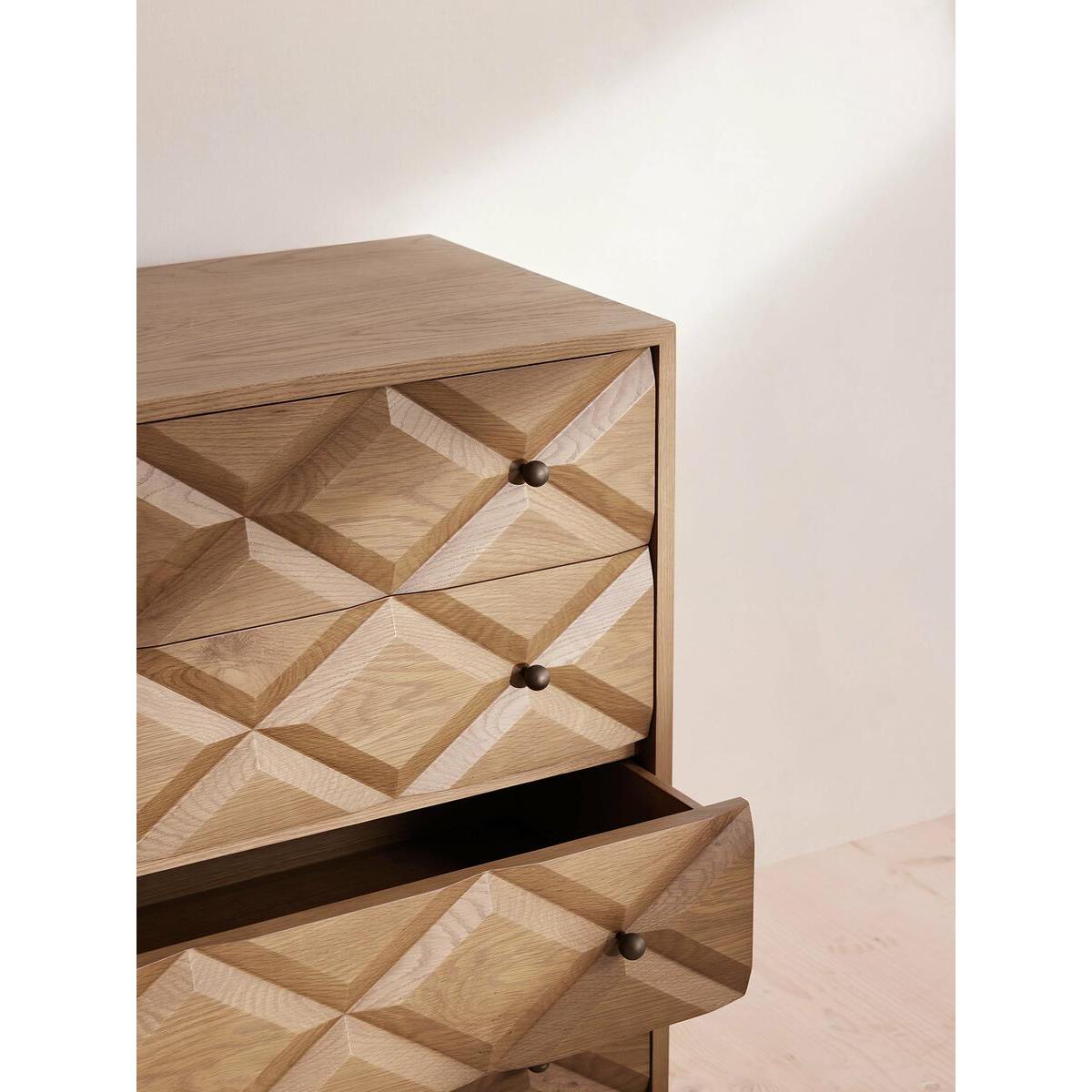 Referencing the furniture seen throughout Soho House Tel Aviv, Jaffa, the Ripley four-drawer dresser is made from solid oak and veneer with a mid-tone finish. Diamond machined-carved drawer fronts and blackened brass handles bring a traditional quality to the piece, while structured, solid oak stump legs add a contemporary touch. Pair with other items from the Ripley collection to echo the bedrooms in the House's turreted building. Four-drawer dresser Mid-tone finish Low and wide form Diamond machined-carved drawer fronts Blackened brass handles Solid oak stump legs Spacious interior Inspired by Soho House Tel Aviv, Jaffa