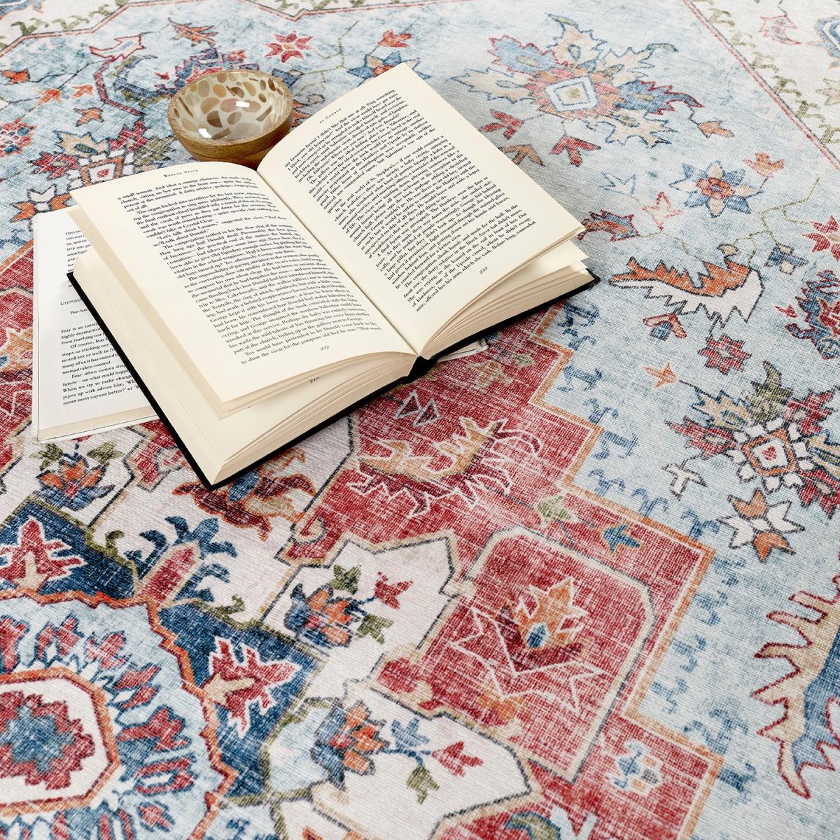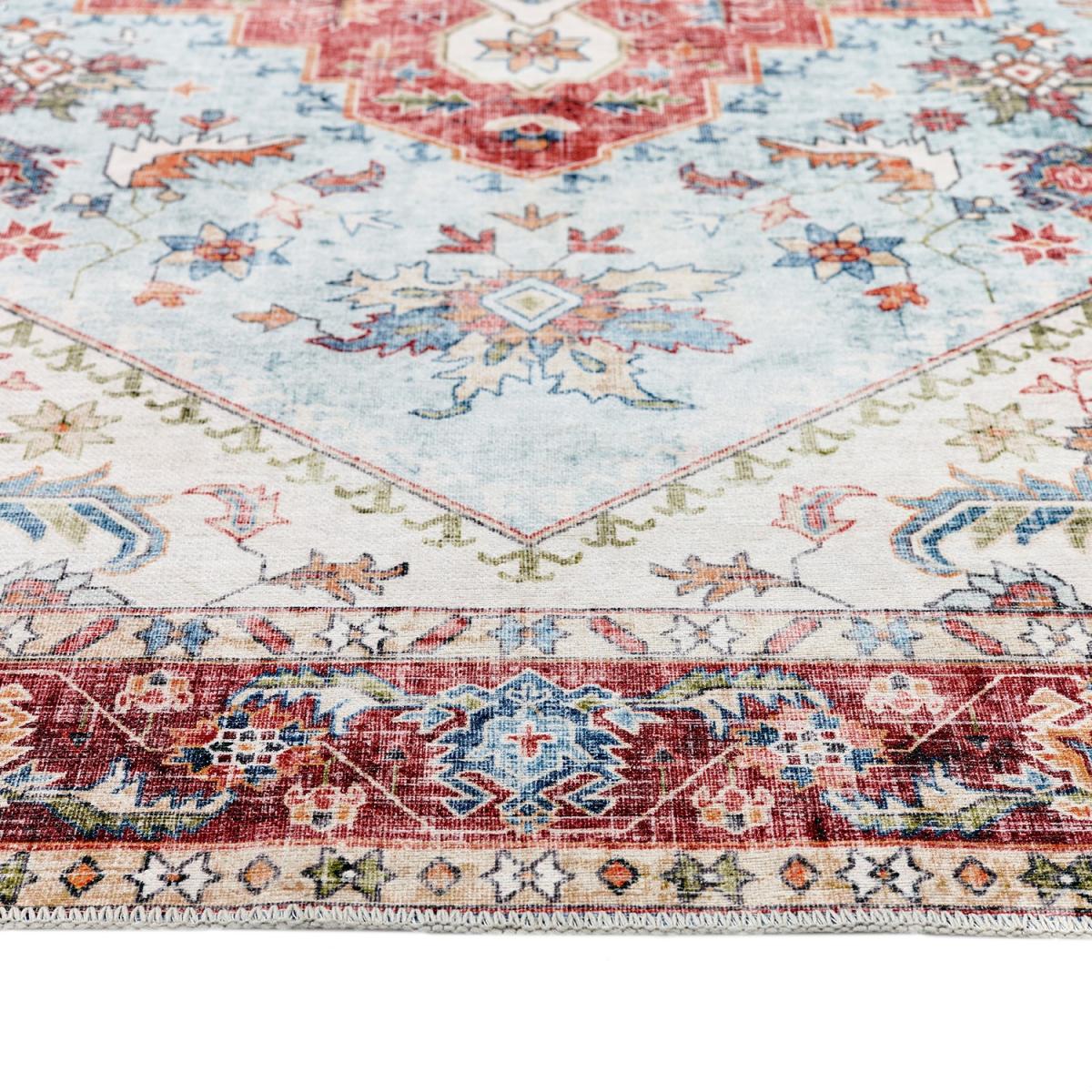 Dimensions:H:230 x W:160cm Washable easy-care rugs are an excellent solution for busy households where spills are bound to occur. Bring some warmth to your home with our Marrakesh design. Inspired by the traditional style and colours you would find in Marrakesh, this rug's rich colours of deep reds with soft blues offer a traditional style with a modern twist. The design featuring a large medallion with an elaborate border with a distressed look. Made from soft, yet hard wearing Chenille and TRP with a non-slip backing, meaning you can easily lay the rug down before and after washing. Ideal for high traffic areas such as your kitchen, hallway, dining room & living rooms. Features: Machine wash at 30, Do not use bleach Line drying is recommended Made from soft, yet hard wearing Chenille, Backing: 50% Tpr + 50% Cotton