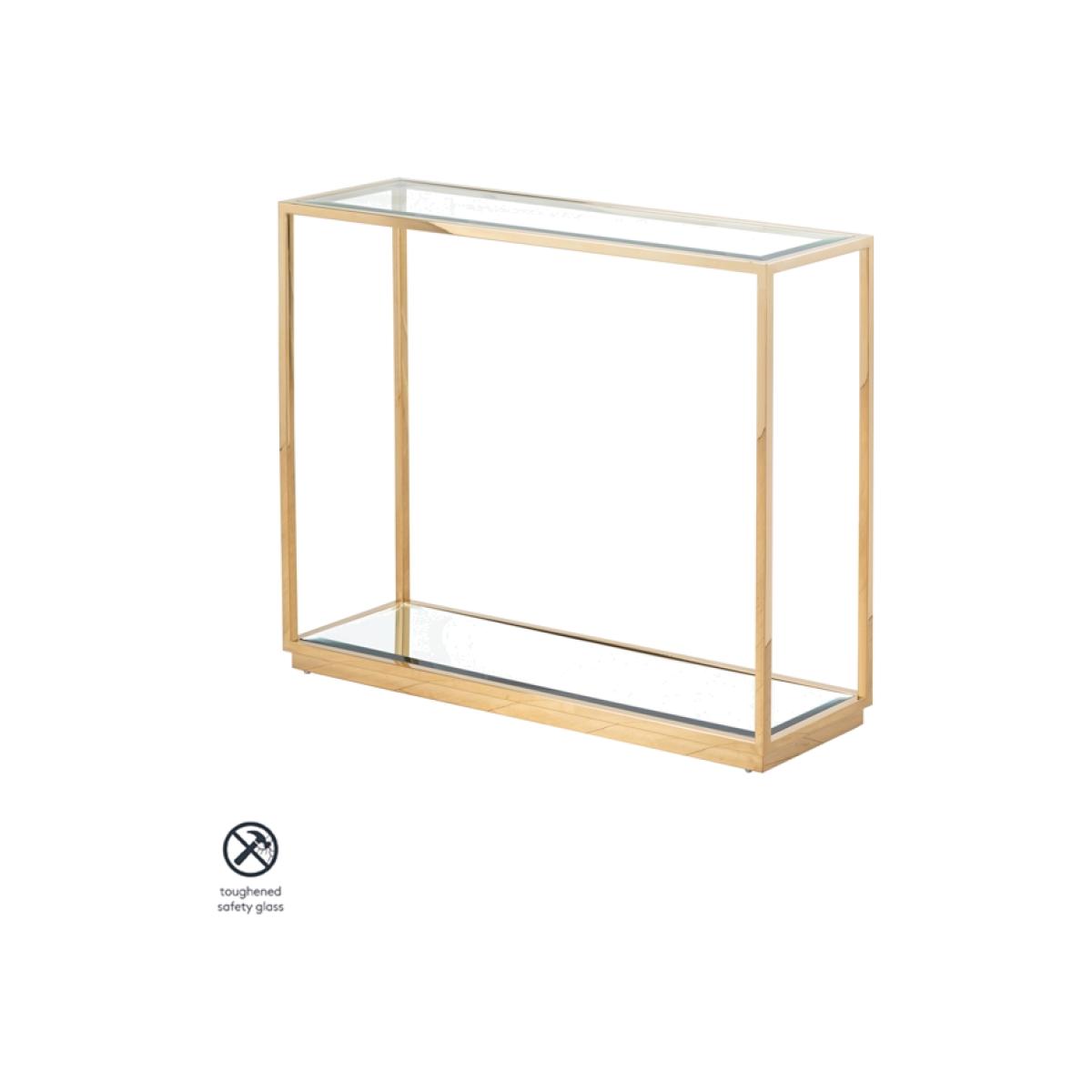 An elegant two-tier console table. Designed specifically to provide a useful storage and display area for hallways, dining and living areas. Polished stainless steel frame with brass finish. Toughened safety glass with bevelled edge top. Toughened mirror with bevelled edge base.