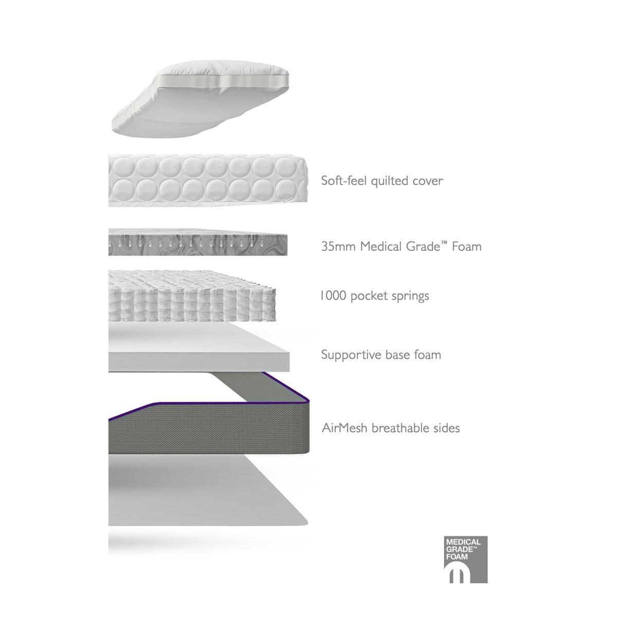 35mm Medical Grade Foam with 1000 Pocket Springs. Born from UK healthcare, Mammoth are experts in helping people feel better. When you choose Mammoth, you can be confident that you’ve bought a mattress that not only feels great, but also does you good too. So, you can be at your best. Mammoth are proud to work in partnership with the Chartered Society of Physiotherapy and their mattresses have been shown to improve sleep in scientific tests by the Centre for Sleep Research. Your introduction to better sleep. A medium feel with 35mm of Mammoth’s Medical Grade Foam layered on top of 1000 pocket springs for a little bounce and all wrapped up in the sumptuous Rise quilted cover. It also arrives in a box – so getting your Mammoth into your bedroom is really easy. -Medium Feel-No Turn Mattress - just rotate to keep the fillings fresh -Depth of mattress - 24cm. For your peace of mind this product is manufactured by a National Bed Federation Accredited Manufacturer and meets all UK Fire Regulations. Product Dimensions: Single: 190cmx90cmx24cm. Double: 190cmx135cmx24cm. King: 200cmx150cmx24cm Super King: 200cmx180cmx24cm. Please remember to measure your available space before ordering. Packaged Dimensions: Single: 105cmx40cmx40cm Weight: 23kg. Double: 150cmx40cmx40cm Weight: 33.3kg. King: 160cmx40cmx40cm Weight: 38.3kgSuper. King: 190cmx40cmx40cm Weight: 45.1kg. This product will be dispatched by one of our trusted suppliers. You’ll be contacted by their selected courier about your delivery.