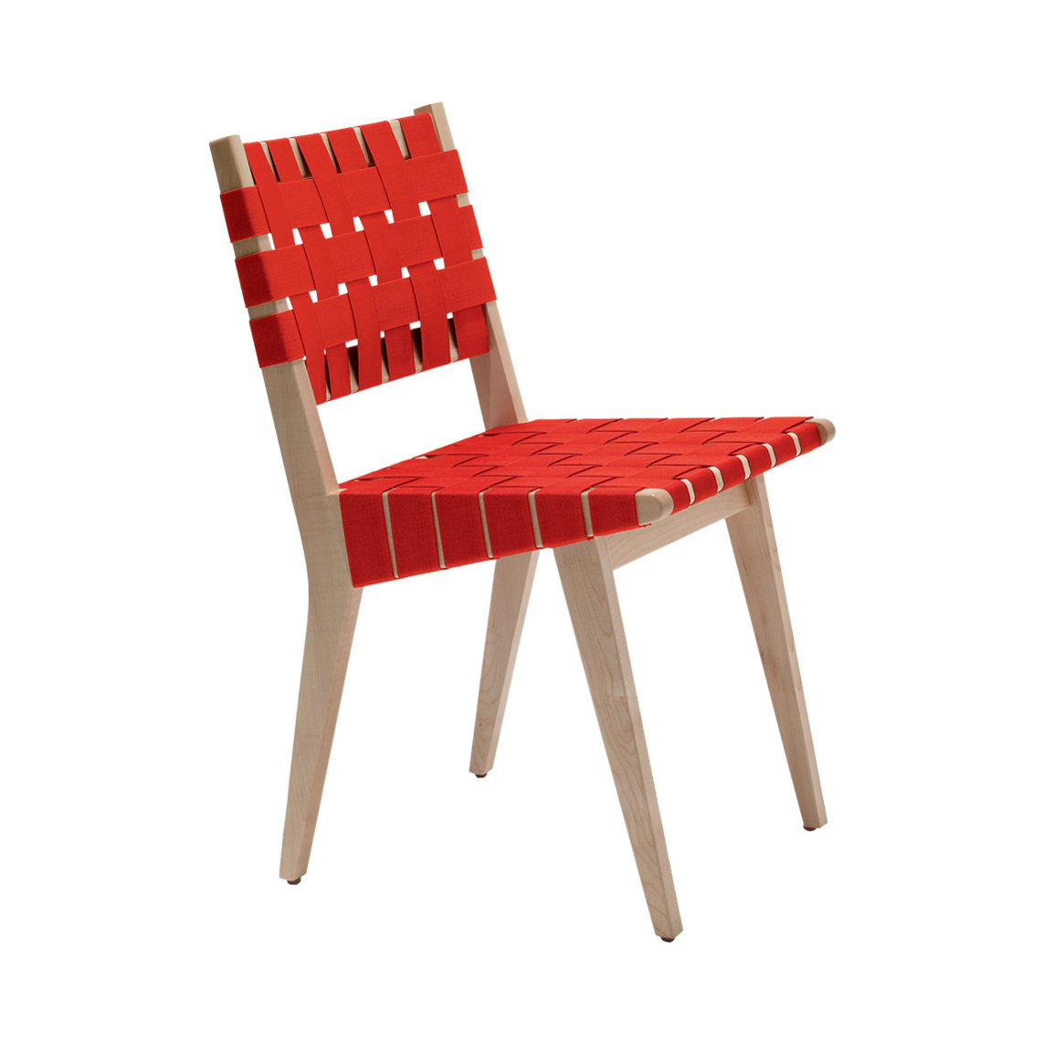 Widely considered a design classic, the red Risom Dining Chair by Jens Risom was one of the first original design models commissioned by Knoll. The Risom Dining Chair features a stylish maple or walnut hardwood frame, angled attractively, and wrapped with woven strips of cotton webbing. The pattern of the chair is a combination of gentle curves and geometric angles. Set the chair in your dining room or position in front of a coffee table for a contemporary style statement.