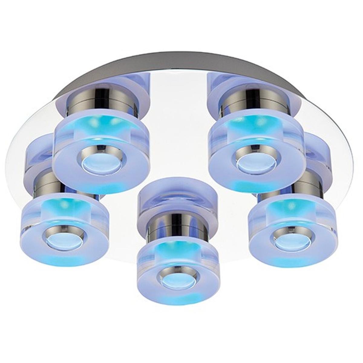 This is a 5-light flush fitting with colour changing LEDs. Supplied with an RGB remote control to easily change the colour effect which can be set to change in sequence, or manually changed to any one colour. Can be moved through red, green and blue or mixed to create pinks, purples etc. Features a polished chrome effect back plate supporting frosted acrylic shades. Also comes in a 3-light fitting