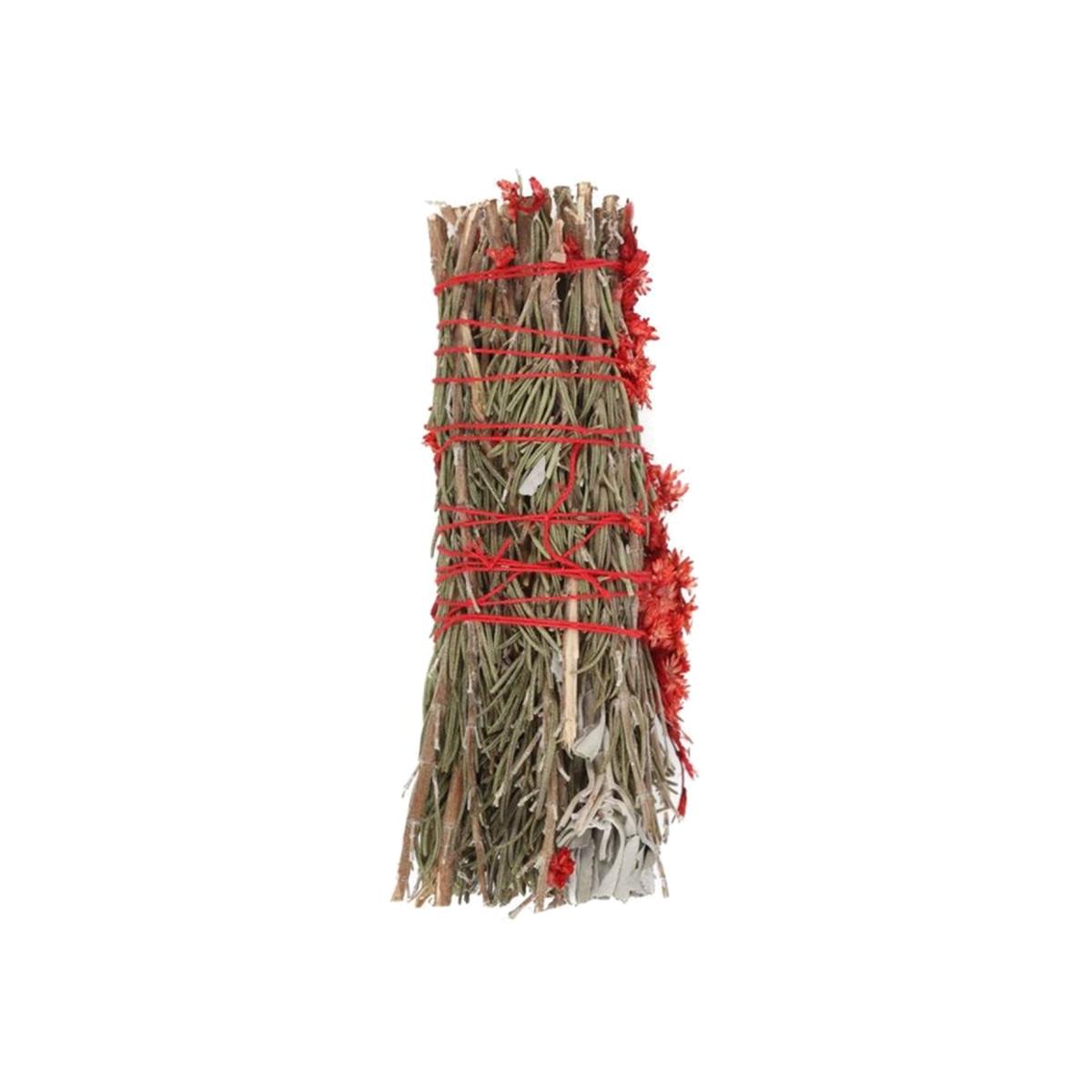 The act of smudging is a traditional Native American practice used to cleanse and purify spaces using the smoke of burning sacred herbs. Sustainably sourced and made in the USA, this beautiful ritual wand features fragrant rosemary, white sage, dried red flowers, orange peel and a raw red jasper crystal thoughtfully handtied into a tight bundle for burning and display. To use, light the end of the sage stick and allow to smoulder, place into a heat-resistant bowl or shell and gently disperse the smoke throughout the area to dispel negative energies. Fully extinguish after use and keep away from pets and children.