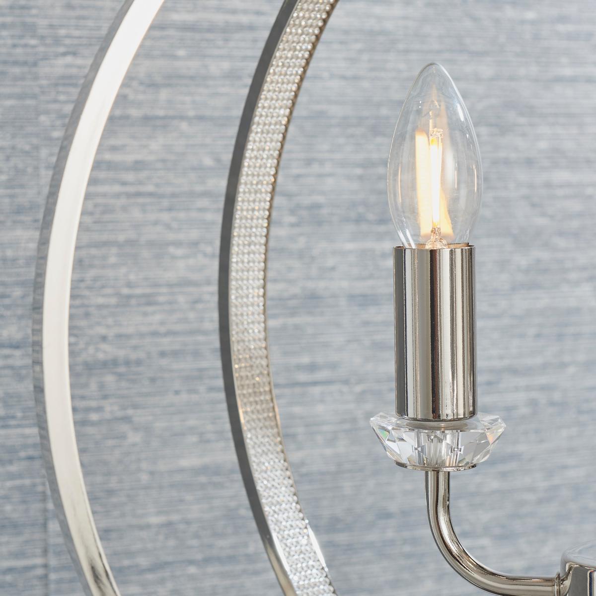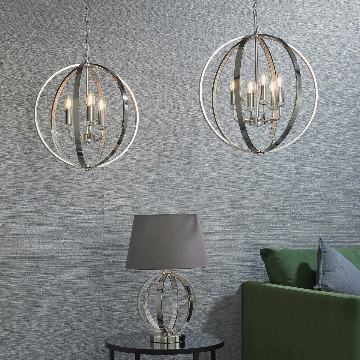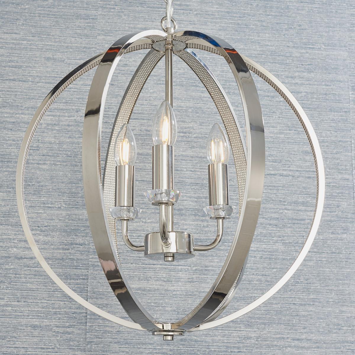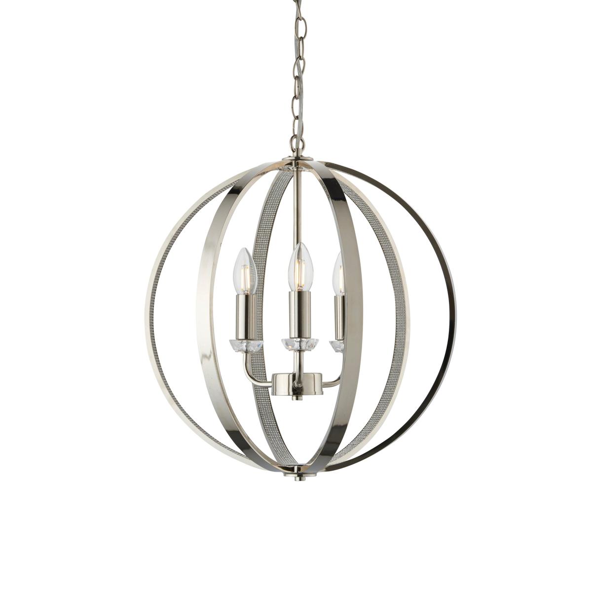 This timeless ceiling pendant combines highly polished bright nickel metalwork encrusted with thousands of clear faceted reflective details with a modern open frame design. Perfect when paired with the latest LED filament lamps. Suspended from height adjustable chain with clear flex.