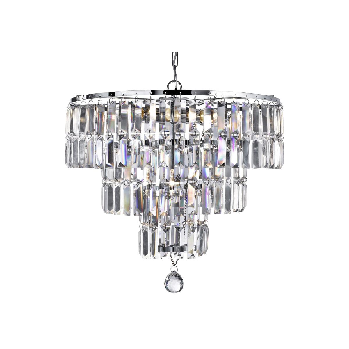 Ritz is a spectacular, glittering 5 light chandelier with stunning rectangular crystal prisms hanging from a modern, chrome finish frame. Create a scintillating, jewellery-like effect with this impactful piece as the main feature in your living area or dining room. The Ritz 5 Lt Pendant is a stunning combination of elegance and functionality. With its five lights, exquisite clear crystal pieces and chrome detail, this chandelier creates a captivating lighting effect that will transform any space into a sophisticated haven. Designed with a tiered structure, the pendant showcases a timeless and luxurious aesthetic. The 5 lights of the pendant provide ample illumination, ensuring a well-lit environment in medium-sized rooms. Height adjustable up to 1.5m, this stunning clear crystal pendant can be adapted to suit different ceiling heights.