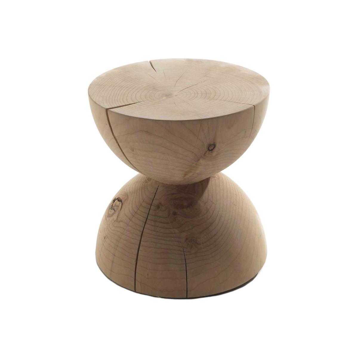 Design. Machined from a single block of solid cedar wood, by placing two hemispheres one above the other this has been beautifully crafted to form its stunning hourglass design. Hand finished from completely natural wood, this simplistic stool boasts gorgeous wooden grain and knot details giving each stool a unique finish while its visible natural cracks provide rustic appeal. For more information and to discuss additional options complete our. Enquiry form. Or. Contact our specialist brand advisors.
