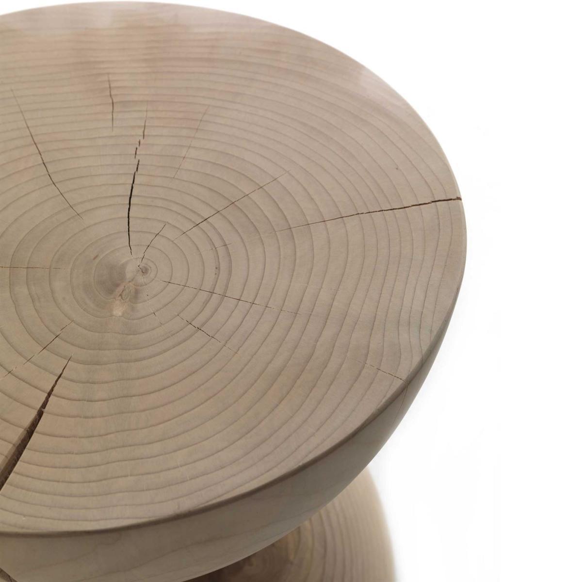 Design. Machined from a single block of solid cedar wood, by placing two hemispheres one above the other this has been beautifully crafted to form its stunning hourglass design. Hand finished from completely natural wood, this simplistic stool boasts gorgeous wooden grain and knot details giving each stool a unique finish while its visible natural cracks provide rustic appeal.