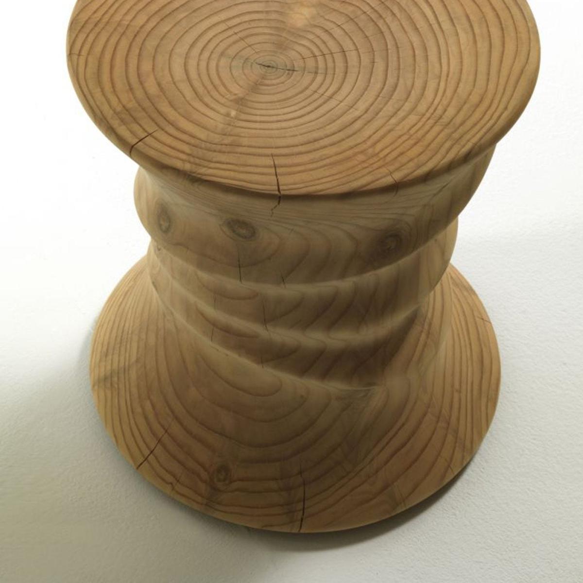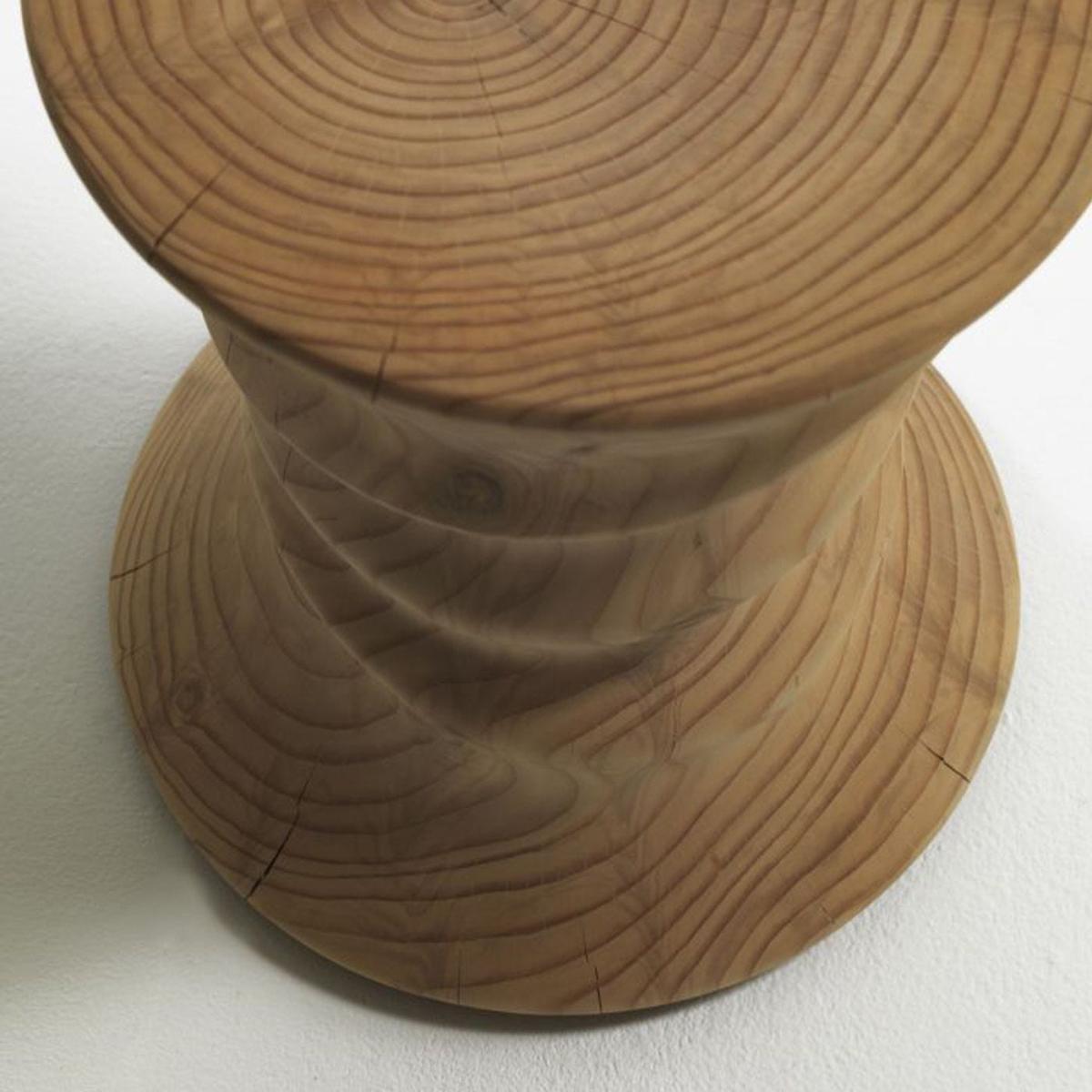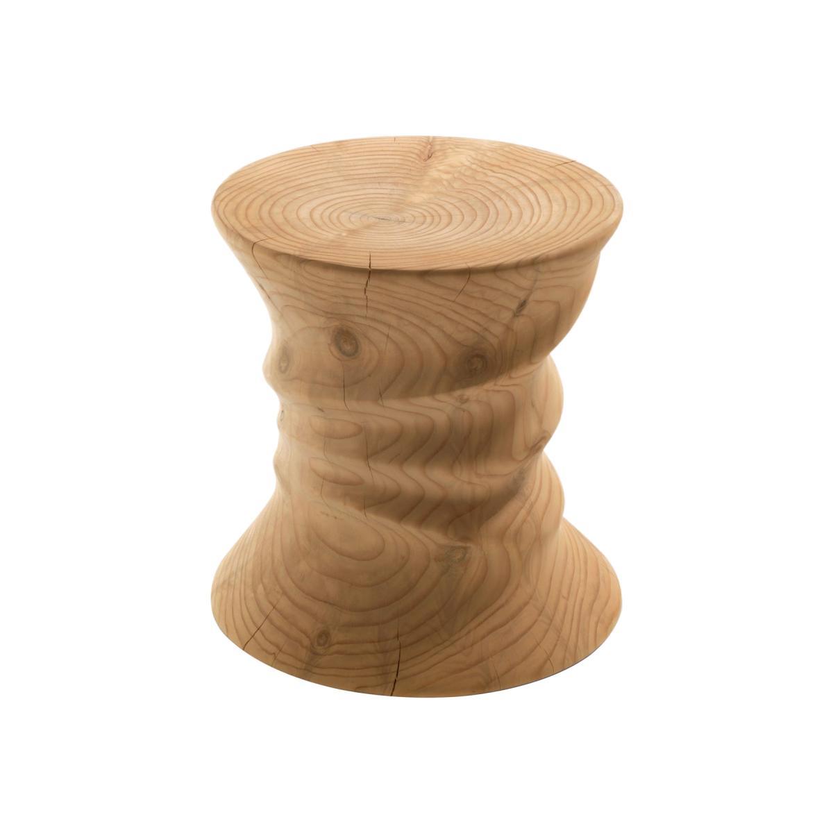 The Squeeze stool is machined from a single block of solid scented cedar, its shape is developed by means of a dynamic concentric spiral. Made from completely natural wood, hand-finished without the addition of any treatment. Any movements, cracks and changes in the appearance of the wood are intrinsic characteristics of these items and result from the natural settlement and diverse environmental conditions of the wood.