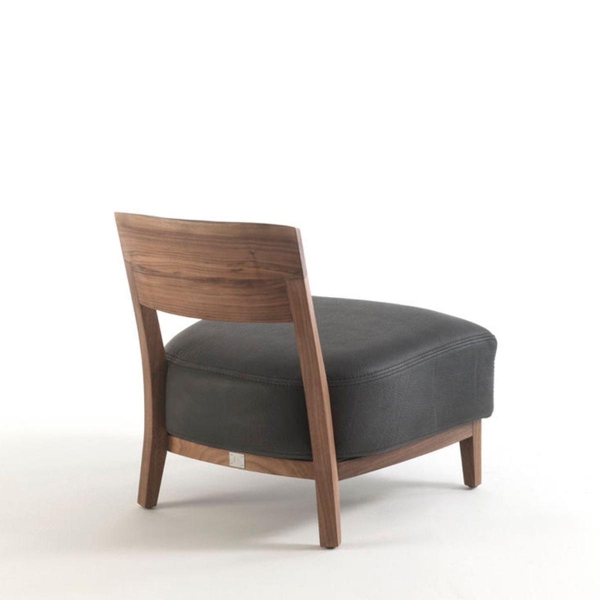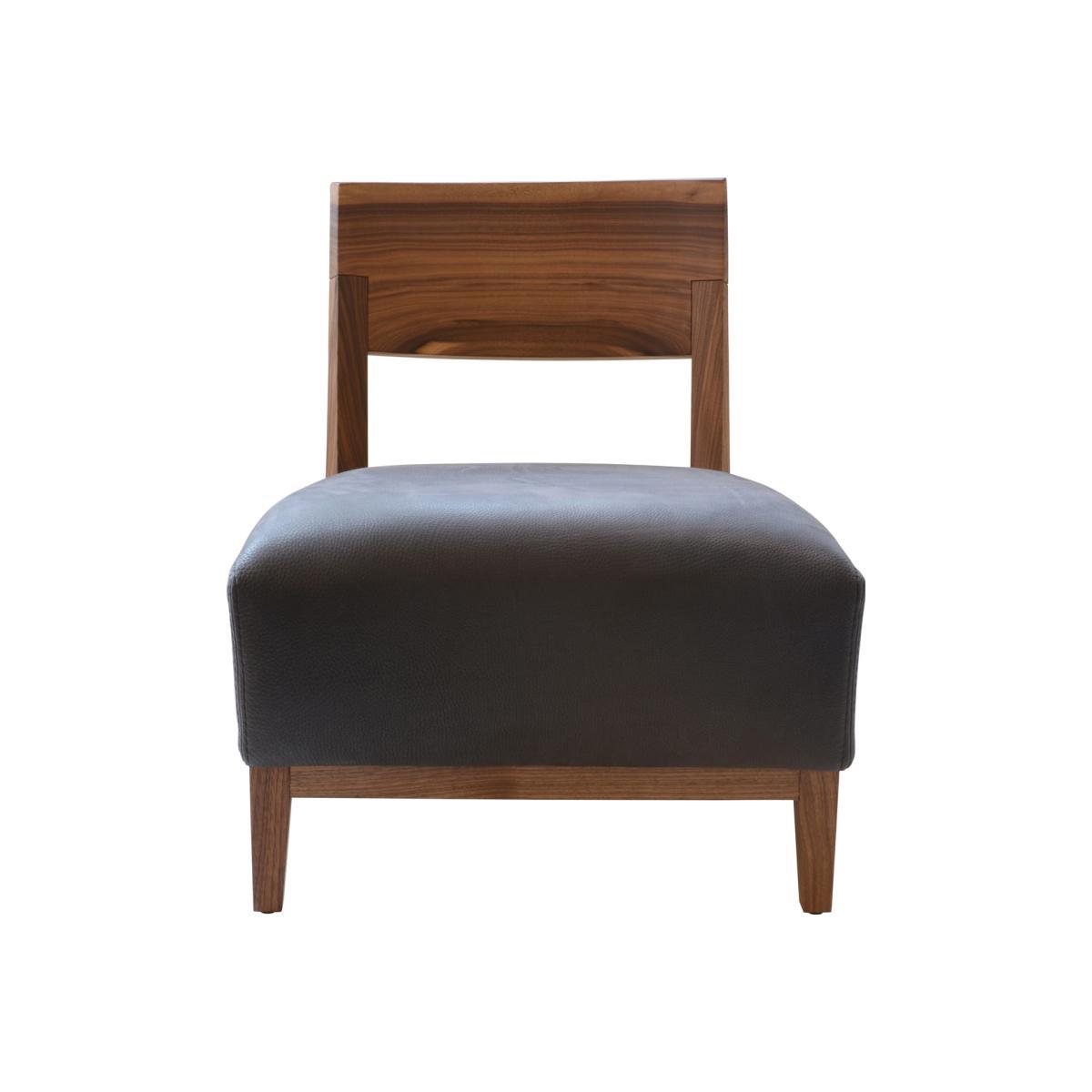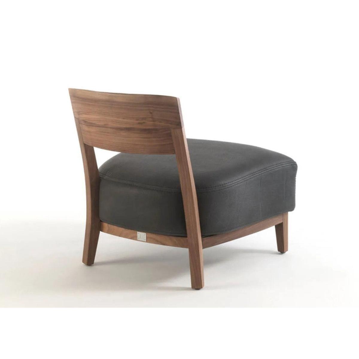 This soft, padded armchair by American designer Terry Dwan embraces comfort, style and robustness. The soft cushion pad in nubuck leather, and gently angled armrests offers a sumptuous sit that encourages the sitter to lean back and relax. Crafted from the highest quality solid walnut, the reassuringly tough craftsmanship on the frame is of the highest standard, and built to last.