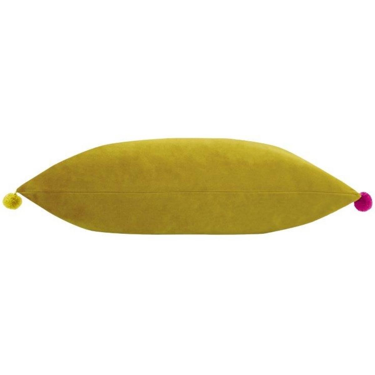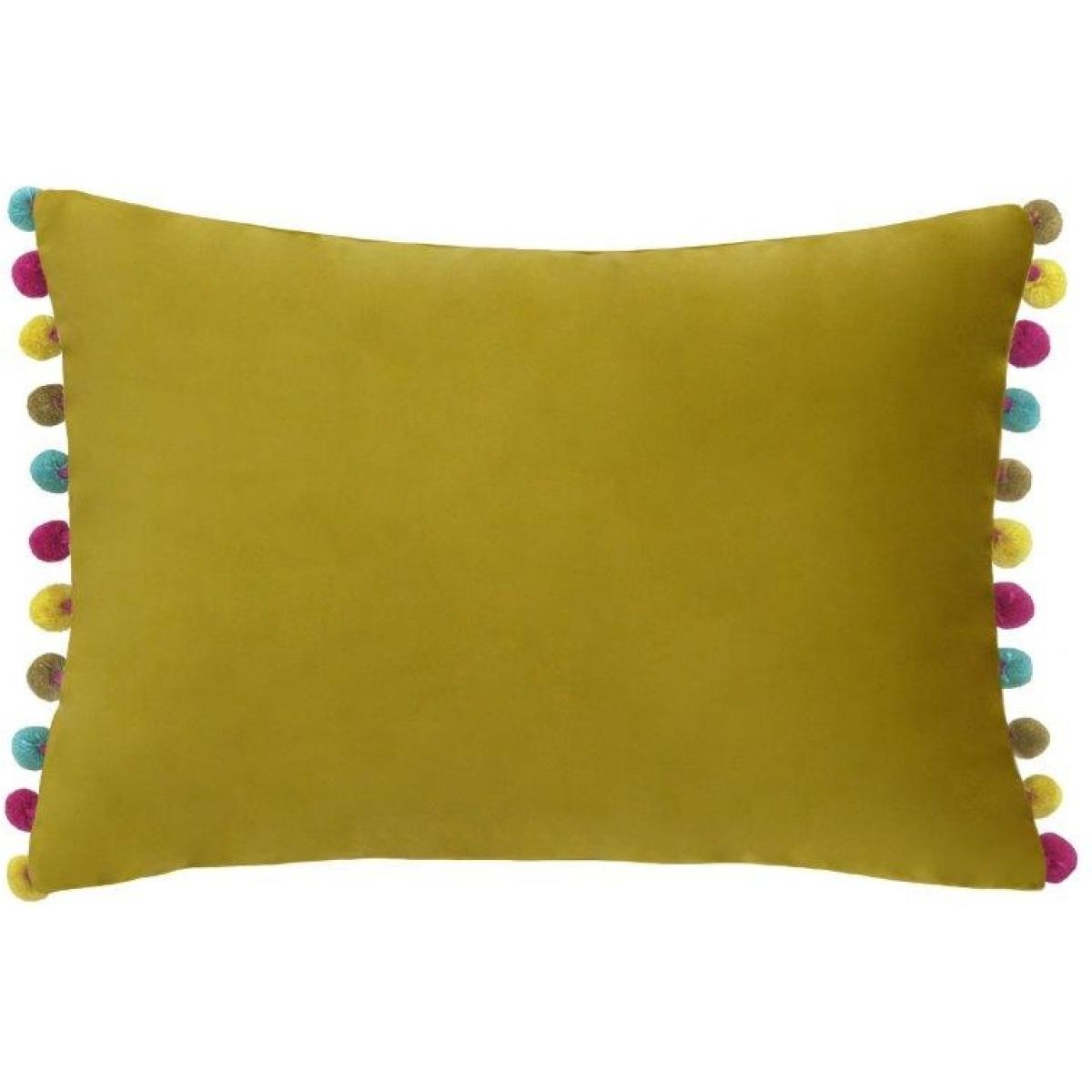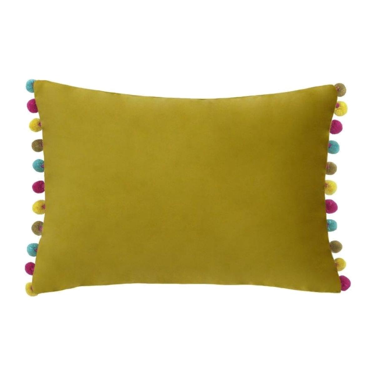 The name gives away this cushions greatest asset. The Fiesta cushion, aptly named after the Spanish word for festival, is a plethora of bright colours and mixed tones.  The velvet body of the cushion is an absolute delight to touch thanks to its sublimely soft texture and catches the light from every angle. Contrasting coloured pom poms feature along the edges to further enhance the fun and tactile nature of this cushion. With a hidden zip closure nothing takes away from this cushions unique design.  While this cushion cover is not machine washable due to its gorgeous pompoms it is iron appropriate. 35x50cm 100% Polyester All screens vary in colour reproduction and whilst every effort has been made to display the colour as accurately as possible it is for guidance only.