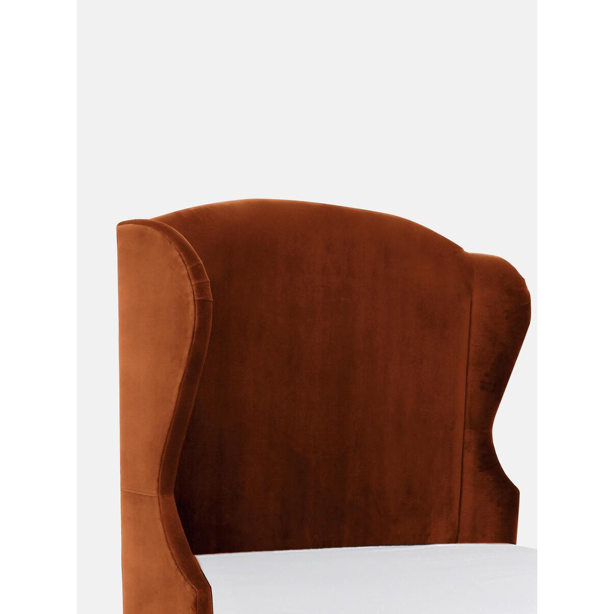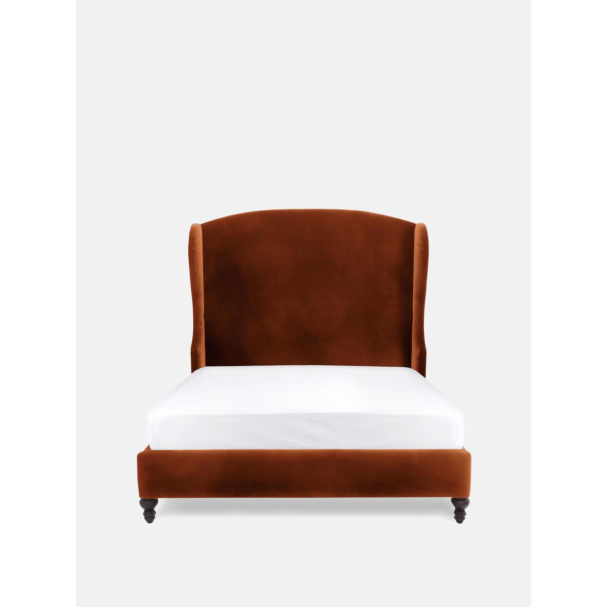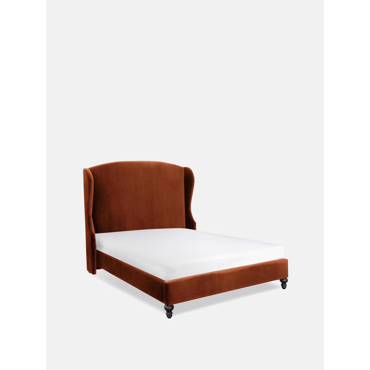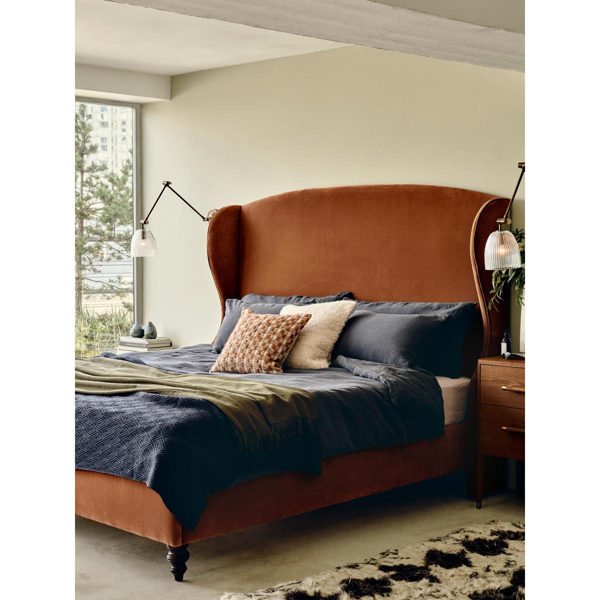 Our upholstered Rivas bedstead is inspired by the beds in the Marina and Corner bedrooms in Soho House Barcelona, where it's madeup with crisp white Frette bed linen and topped with a stripymonochrome throw. Velvet upholstered winged bedstead. Bedstead includes headboard, frame and slats. Mattress is not included and can be purchased separately. Hand made in the UK by skilled craftsmen. Inspired by the beds in the bedrooms at Soho House Barcelona.