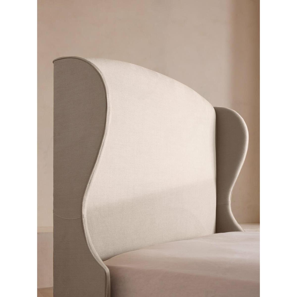 The oversized winged headboard of our Rivas bed helps create a cocooning effect for a good night's sleep. Handcrafted in the UK, it's been upholstered in natural linen and sits on dark, turned hardwood feet. Place in the centre of the room as a feature piece with crisp bed linen and printed textiles to recreate the bedrooms of Soho House Barcelona. King-size bed Handcrafted in the UK Oversized winged headboard Upholstered in 100% linen Available in other fabrics and colours Turned hardwood feet Pair with our SH Hypnos King Mattress Inspired by Soho House Barcelona