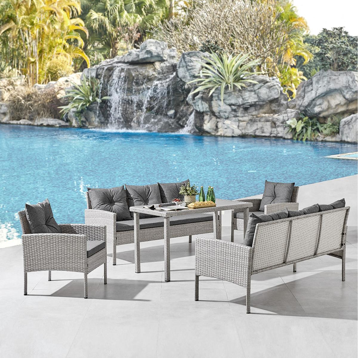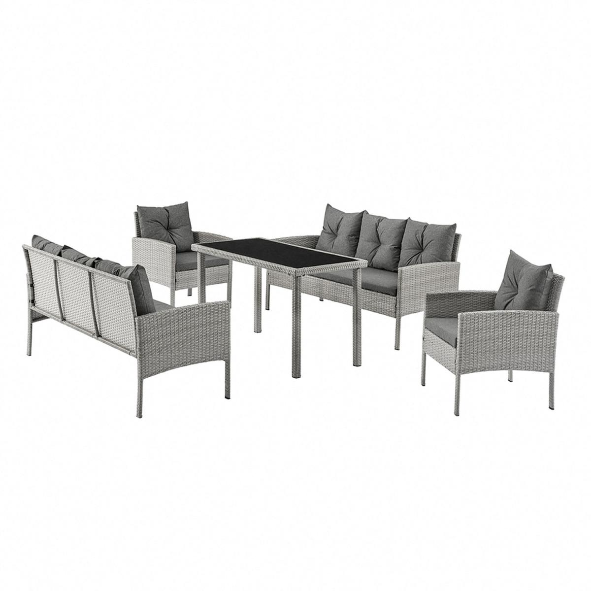 Introducing Rivas rattan dining Set. It is available in a stunning grey with a plush dark grey contrast cushions. Sit up to 8 people with 2x 3 seater garden sofas 2 single chairs. Perfect for dining al fresco! The dining table comes with a black tempered glass table top for a modern look. The plush dark grey cushion covers are not removable, and we recommend you bring them when not in use. They are not waterproof cushions. Please note this set does not include a cover. The rattan is waterproof and can withstand wet weather but we highly recommend purchasing a cover as long periods in wet damp weather will eventually damage the item. The cushions are not fully waterproof, we recommend these are kept indoor or dry area when not in use all year round. This item comes flat packed and requires self-assembly. a full assembly guide is included with this item. This set is delivered by our 3rd party 2 man courier service within 2-5 working days, The courier will deliver to the first floor room of choice only, they will not take the item up more than 1 flight of stairs. They will provide a 2 hour window slot on the day of delivery but can delivery outwith this period depending on the route network that day.