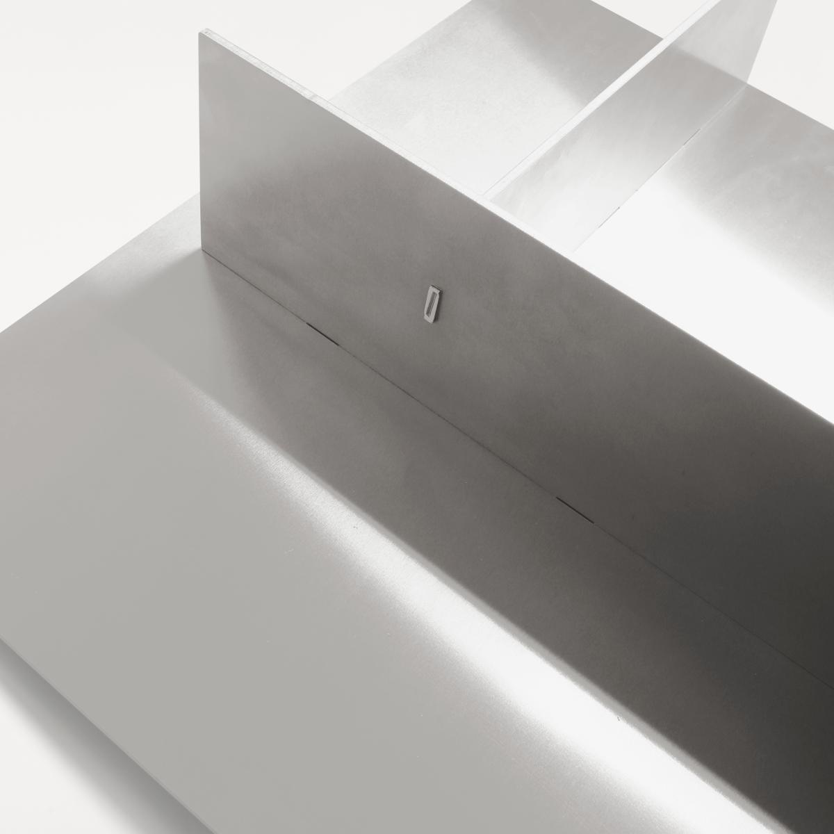 Made from hand-hammered Aluminium, the Rivet collection draws its inspiration from the industrial aesthetic associated with brutalism. This furniture showcases the simplicity and raw, untreated look of Aluminium. Rivet Typecase is a compartmentalized wall shelf with different sections designed to store and display your most precious objects.