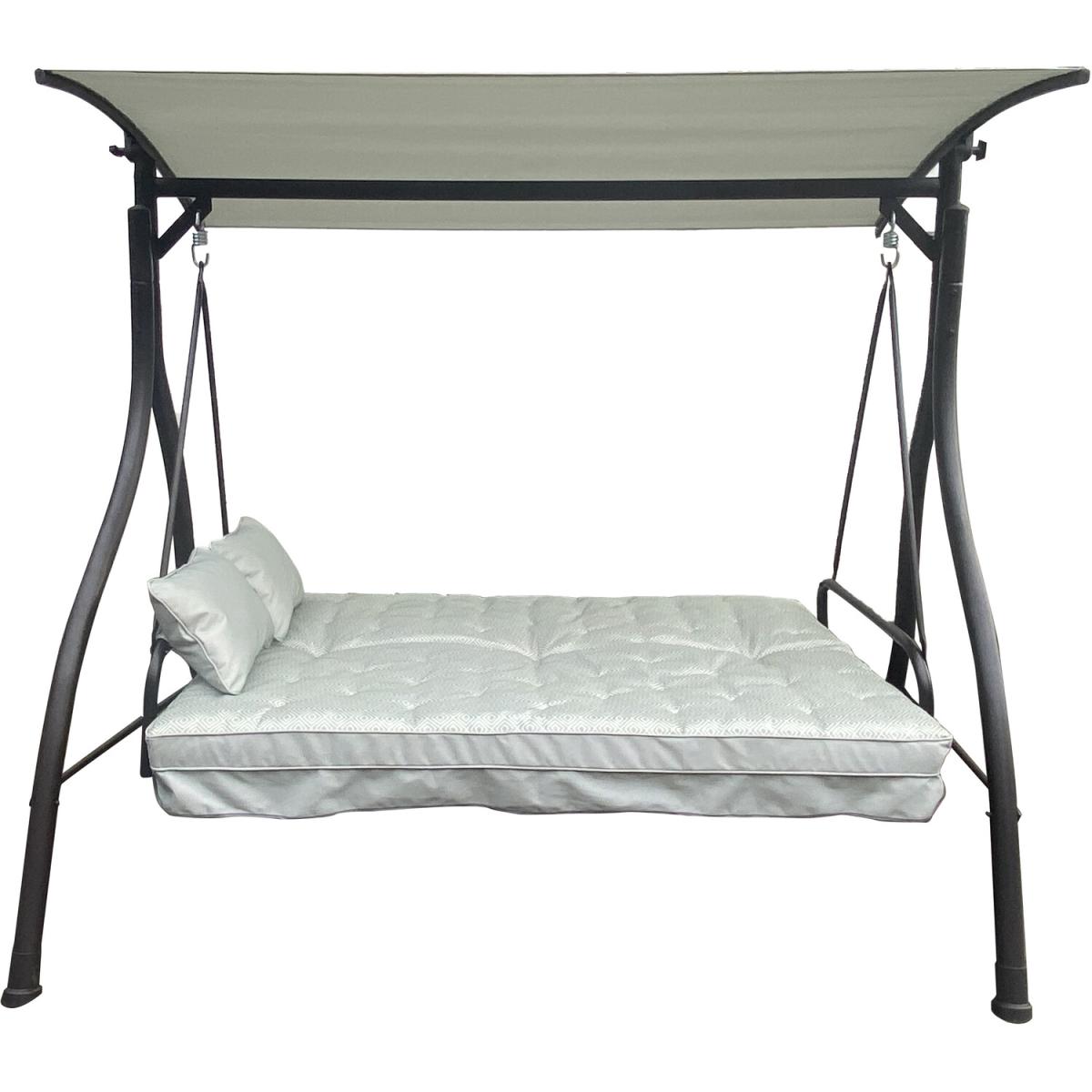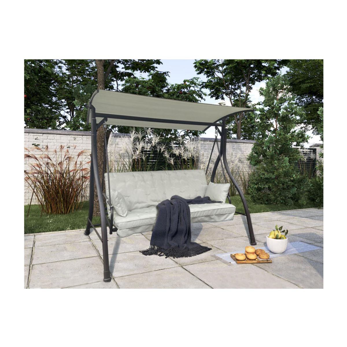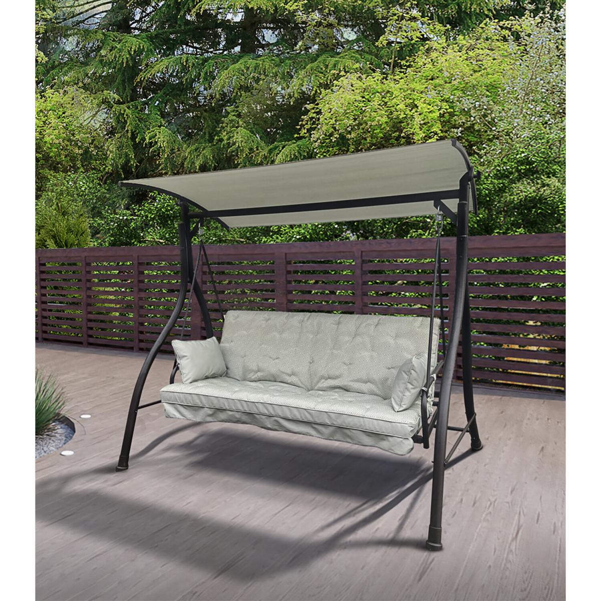 Swing under the sun and sleep under the stars with the Riviera 3 Seater Swingbed Combo. This classically designed garden swing can be folded back until it becomes a swinging mattress, so you and a loved one can truly lounge about and relax. The plush cushion features a beautiful design, and two comfortable head cushions are included. An adjustable canopy is set across the top, providing shade from harsh sunlight if needed, while the sleek black steel frame will complement your garden greenery.