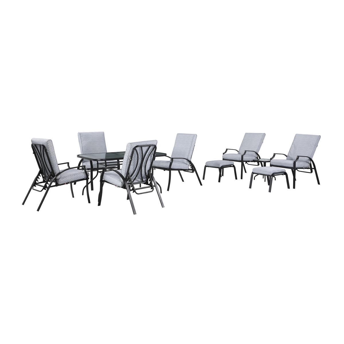 Enjoy cosy outdoor meals with the Riviera Dining Set, a perfect blend of style and comfort. This modern dining solution is designed to elevate any meal with its sleek black powder-coated, weather-resistant steel frame, making it a versatile addition to any patio or garden. The set includes six plush chairs with comfortable seats and backs, offering relaxation and support as you dine. The elegant dining table features a clear glass top that complements the black frame, while the square-shaped side table adds a touch of sophistication. With its updated cushion pattern and refreshed colour scheme, this dining set enhances your outdoor space with style and functionality.