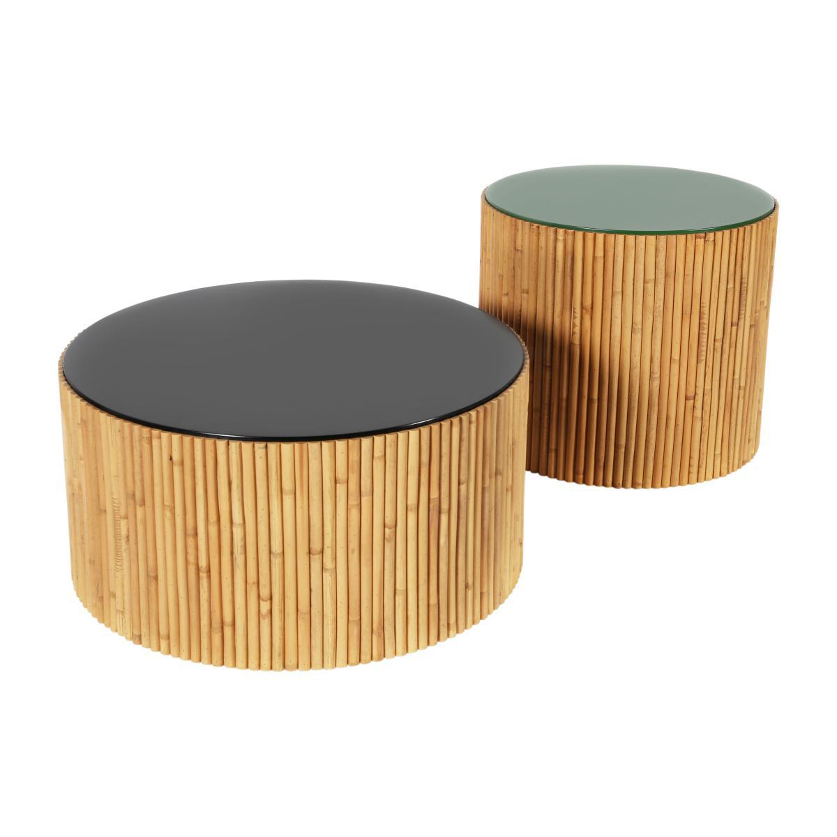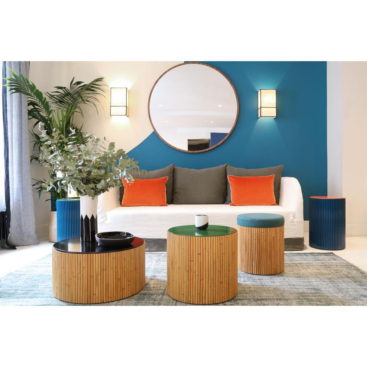 Sarah Lavoine's Riviera collection features an old-fashioned Art Deco aesthetic, inspired by the French Riviera of the 1920s. This set consists of two coffee tables of different sizes and colours that form a graphic unit. These tables mix natural material and trendy colours. Evoking the 1960s and 1970s, rattan gives this piece of furniture a vintage look. This retro feel is counterbalanced by simple, modern lines and a palette of carefully chosen colours with a contemporary lacquered finish. The rattan’s vertical grooves have a serrated contemporary, feminine and graphic aspect to them. Riviera coffee tables offer a subtle blend of elegance and relaxation that fulfils our need for something different mixed with nostalgia. These coffee tables are handmade in Spain.