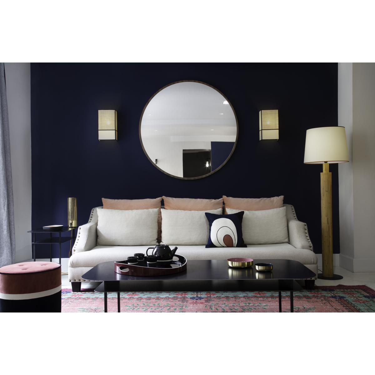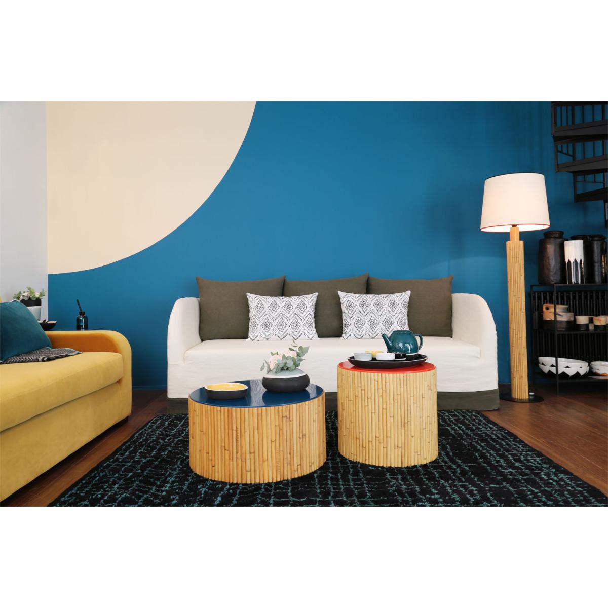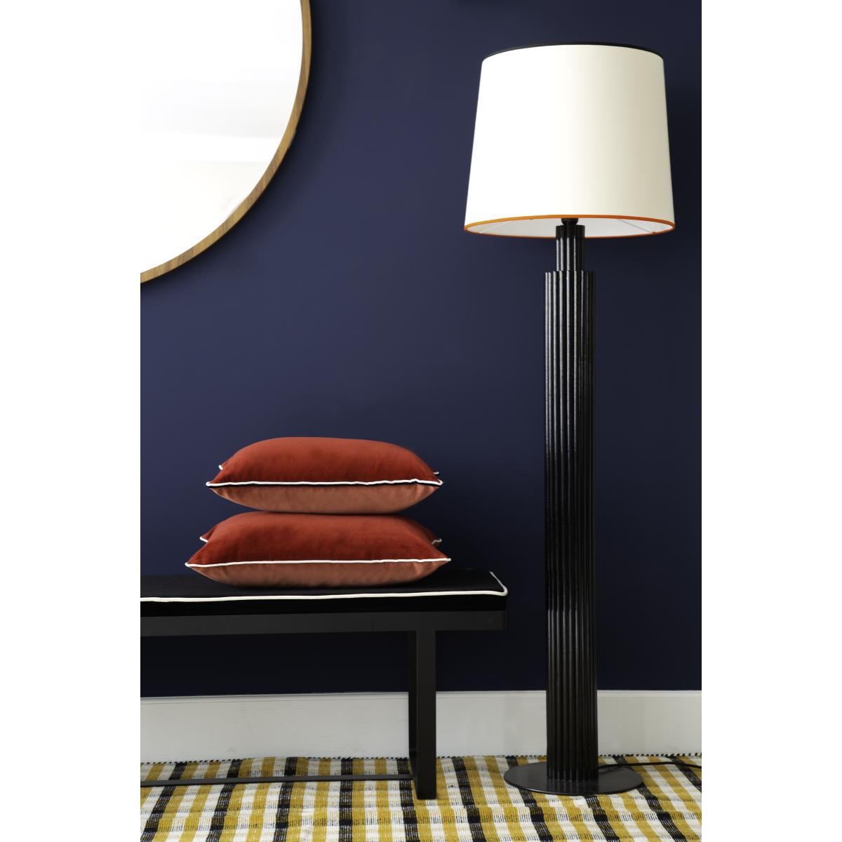 Sarah Lavoine's Riviera collection features an old-fashioned Art Deco aesthetic, inspired by the French Riviera of the 1920s. This floor lamp uses an elegant combination of materials. The wide fluted foot is made of black lacquered rattan. Its vertical grooves have a contemporary, feminine and graphic serrated look. With its couture feel, the white cotton lampshade is decorated with two pieces of coloured piping. The Riviera lamp offers a subtle blend of elegance and relaxation that fulfils our need for something different mixed with nostalgia.