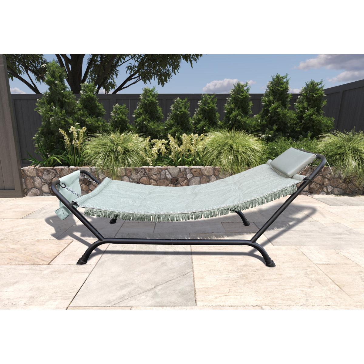 The Riviera Hammock will add a stylish and elegant touch to your garden or patio. Perfect for lounging in the sun, this hammock is designed with a hanging pocket to keep your favourite reading materials and other items within reach. Constructed of a rust-resistant powder-coated steel frame, this weather-resistant, one-person hammock provides you with comfort and relaxation.