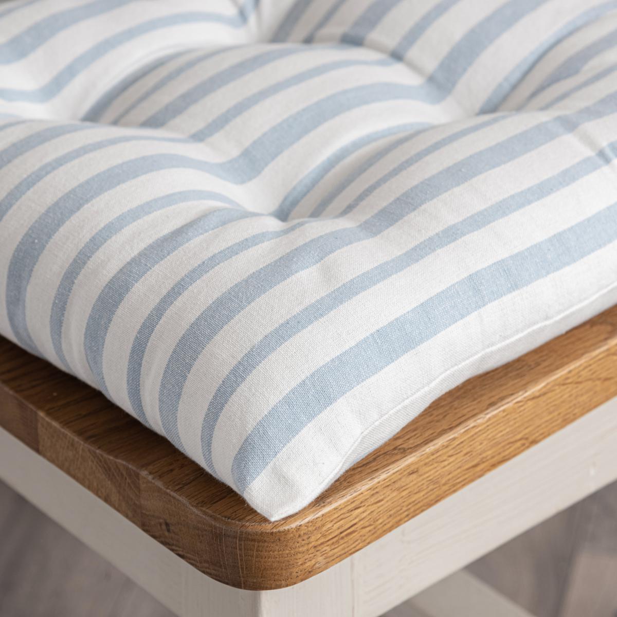 I love this seat pad for its fresh, classic stripe pattern in shades of blue, which adds a touch of coastal or country charm to any dining or kitchen chair. It works particularly well in both traditional and contemporary interiors, providing a cosy update without overwhelming the space. Practical styling tips include layering it with darker or neutral-toned fabric cushions for added comfort, or pairing it with wooden or painted furniture for a light, airy feel. It's a versatile choice that can easily be swapped between chairs or used in a breakfast nook to inject a bit of colour and pattern into your everyday spaces.