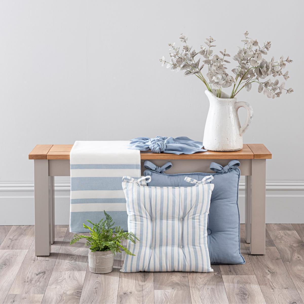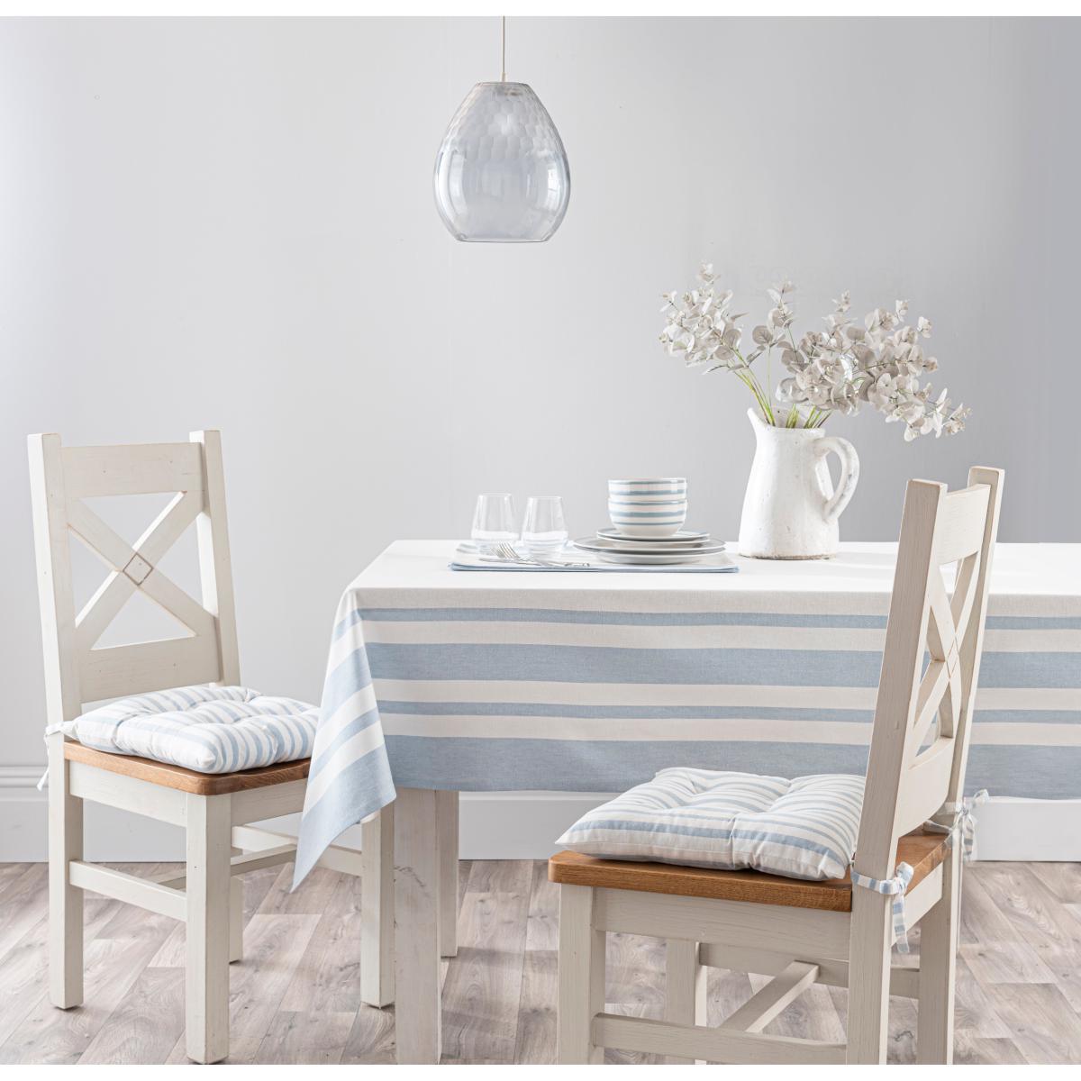 Featuring a woven stripe in Ashley blue colour, this seat pad will form a fresh base for your table setting. Made from 100% cotton plumply filled with 100% recycled polyester fibres, the seat pad comes complete with ties and attractive stitching detail. Coordinate with matching items from the Riviera range, such as tablecloths, table runners and placemats.