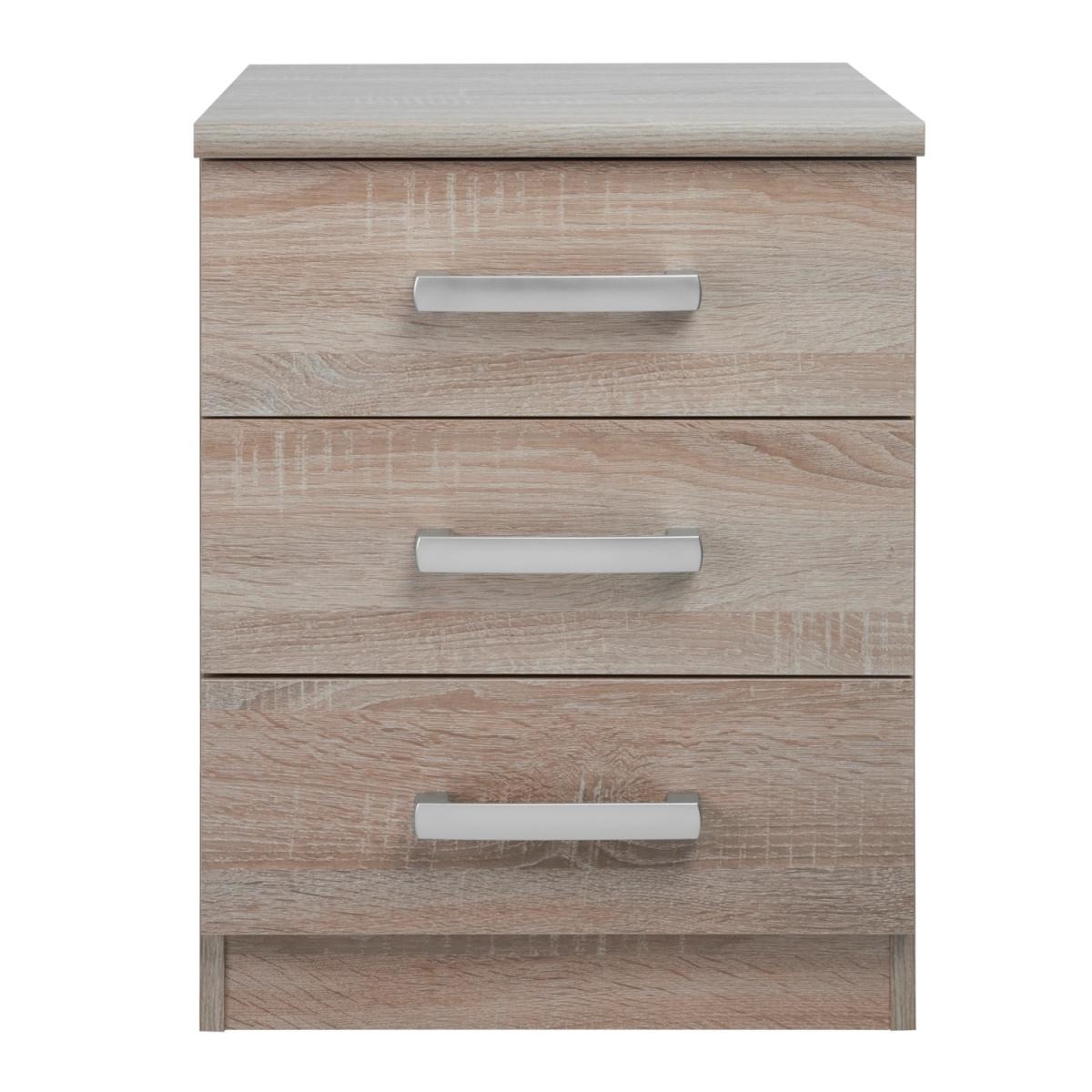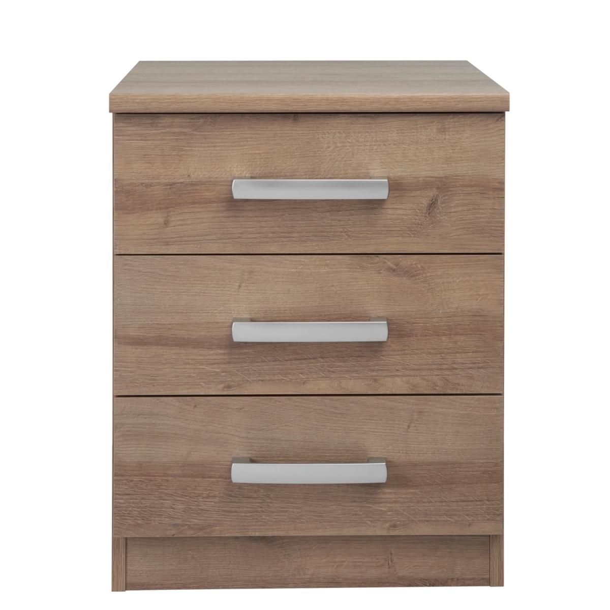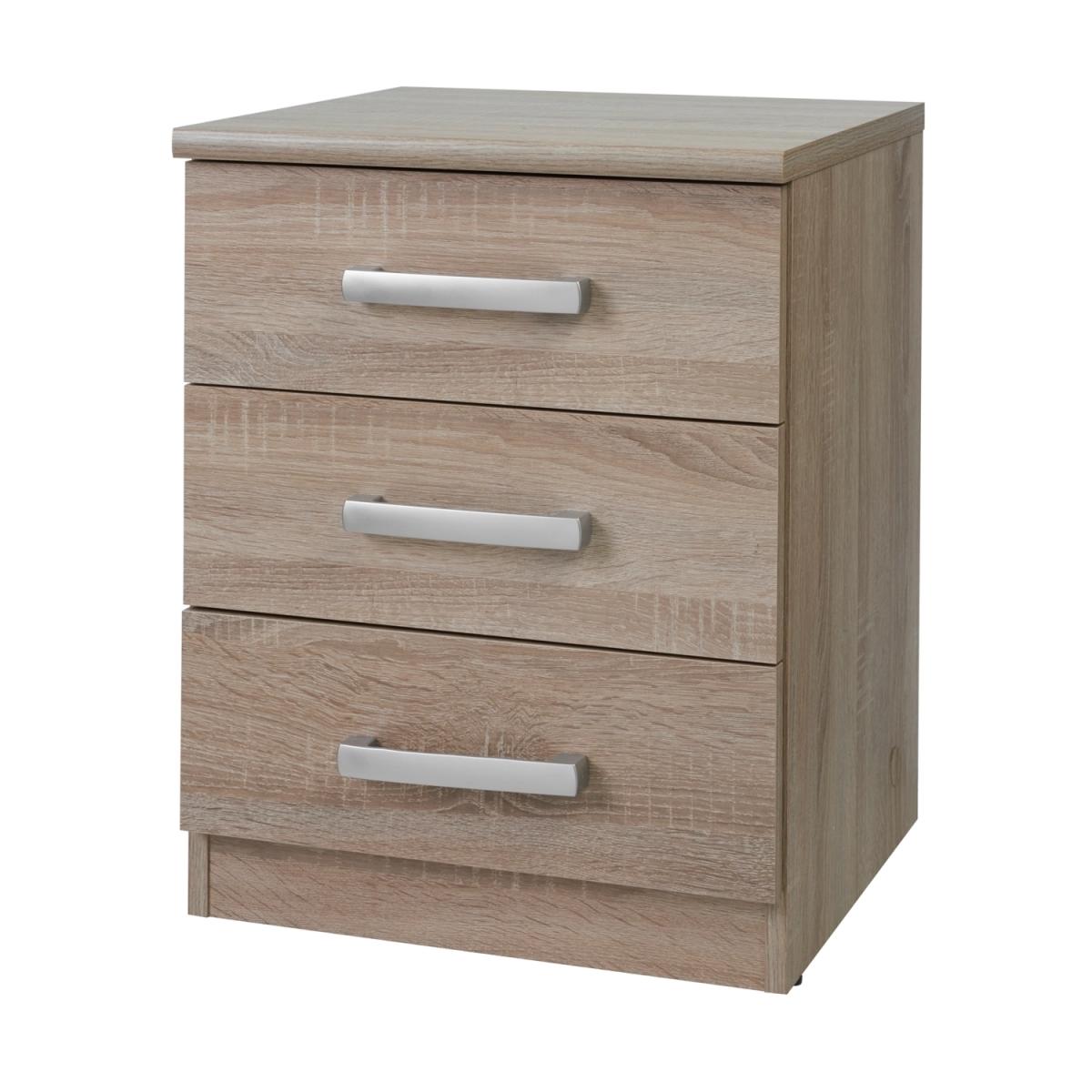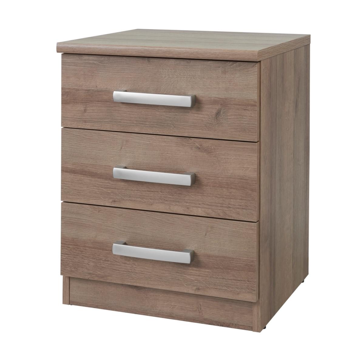 This gorgeous Riviera Three Drawer Bedside Table is a stylish and sophisticated piece of bedroom furniture, combining both style and practicality. Its easy grip, chrome effect handles gives access to three spacious drawers, perfect for storing cosmetics, your favourite reads, important paperwork and more. With three storage compartments, the chest will allow you to organise all your goods, keeping your bedroom neat and tidy, whilst the flat top surface is ideal for displaying alarm clocks, your photo memories or a lamp for a spot of late-night reading. The smart oak effect will seamlessly match almost any decor, adding that wonderful, contemporary finishing touch to your bed and bedroom.
