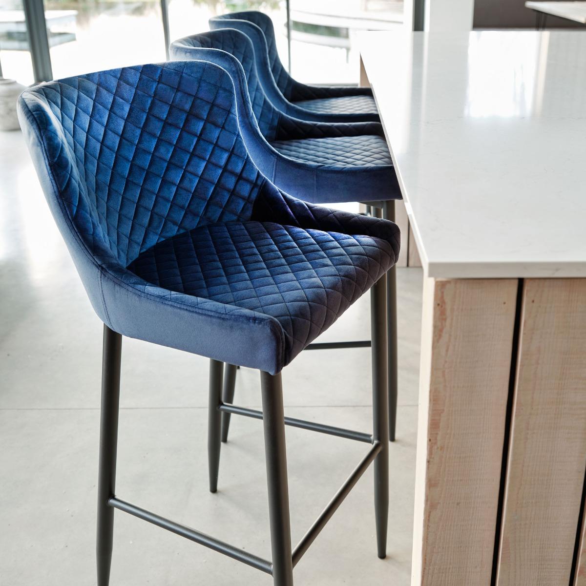 I love this velvet stool for its slim, quilted back and matt-black legs - it’s both comfortable and refined. It works brilliantly in modern kitchens, industrial lofts or monochrome schemes, especially paired with a white marble island or a timber breakfast bar. Keep your styling minimal: a couple of aged-brass pendants overhead, a neutral stoneware tumbler on the counter and let the velvet be the focal point. For extra comfort, add a slim lumbar cushion in a contrasting leather or wool blend.