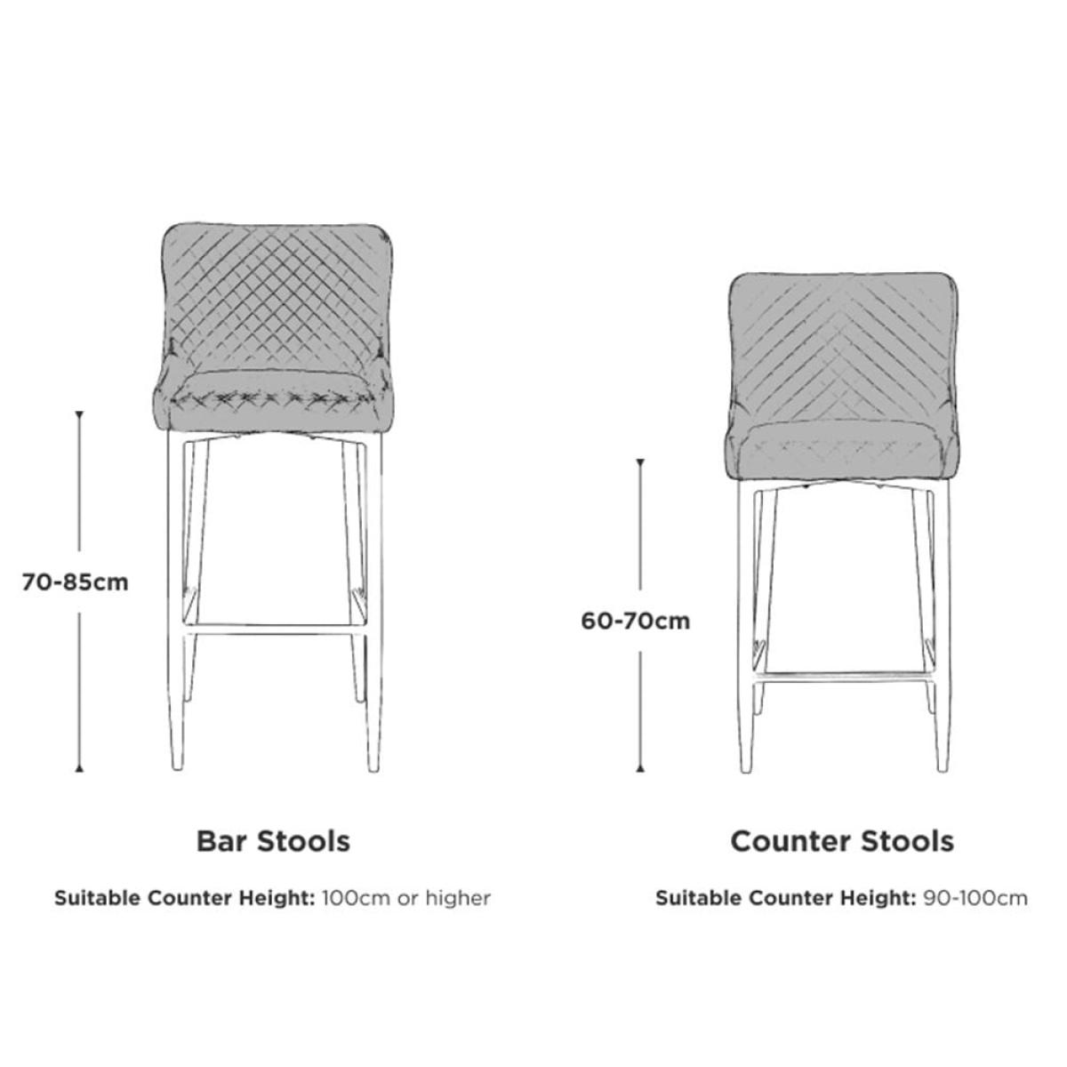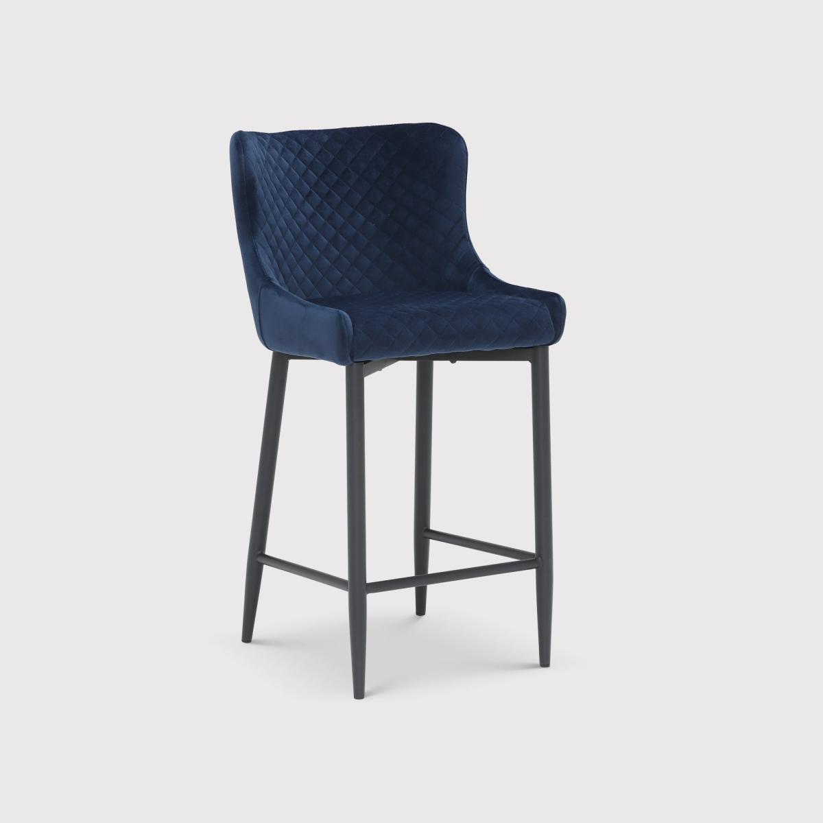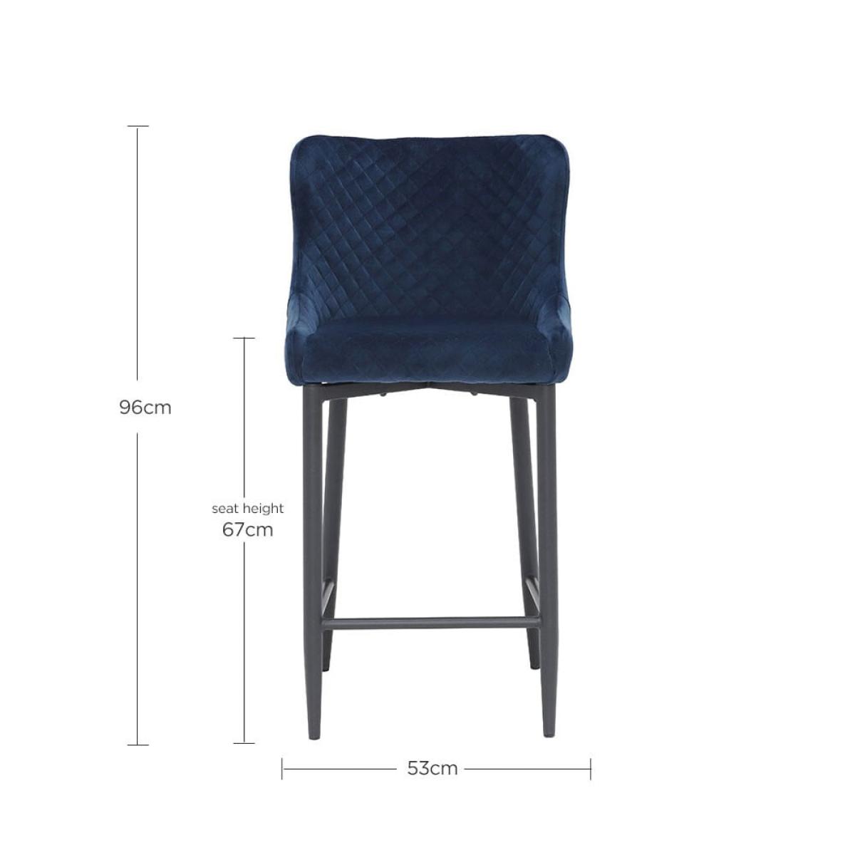 The Rivington counter stool seamlessly combines comfort, convenience, and contemporary style, making it an ideal addition to any dining space. Designed at the perfect height for kitchen islands or breakfast bars, it offers quality casual seating without sacrificing space. The slim black metal legs create an open feel, while the quilted blue velvet seat exudes luxury. With a curvaceous backrest and supportive foam cushioning, this stool provides an elevated level of comfort. The fixed foam seat cushion ensures a consistent and enduring seating experience.