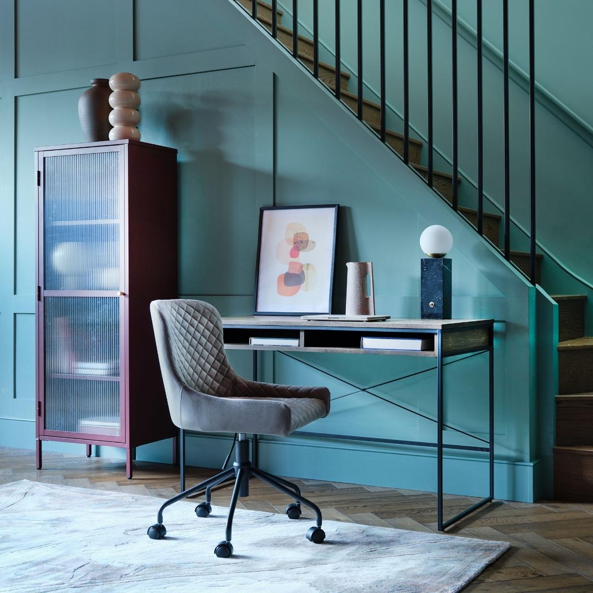 I love the Rivington chair for its versatile and contemporary look, making it a great addition to both home offices and stylish workspaces. Its grey velvet finish brings a touch of softness and luxury, while the quilted backrest adds subtle texture without overwhelming a minimalist aesthetic. This chair works well in modern interiors with neutral palettes, but can also add a cosy, sophisticated feel to more eclectic or vintage-inspired setups. For styling, consider pairing it with sleek desks or dashes of metallic accents for a polished look. Practical tips include positioning it in a corner for a reading nook or combining it with a statement side table to create a chic, functional workspace that balances comfort and style.