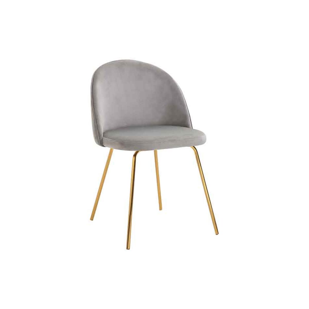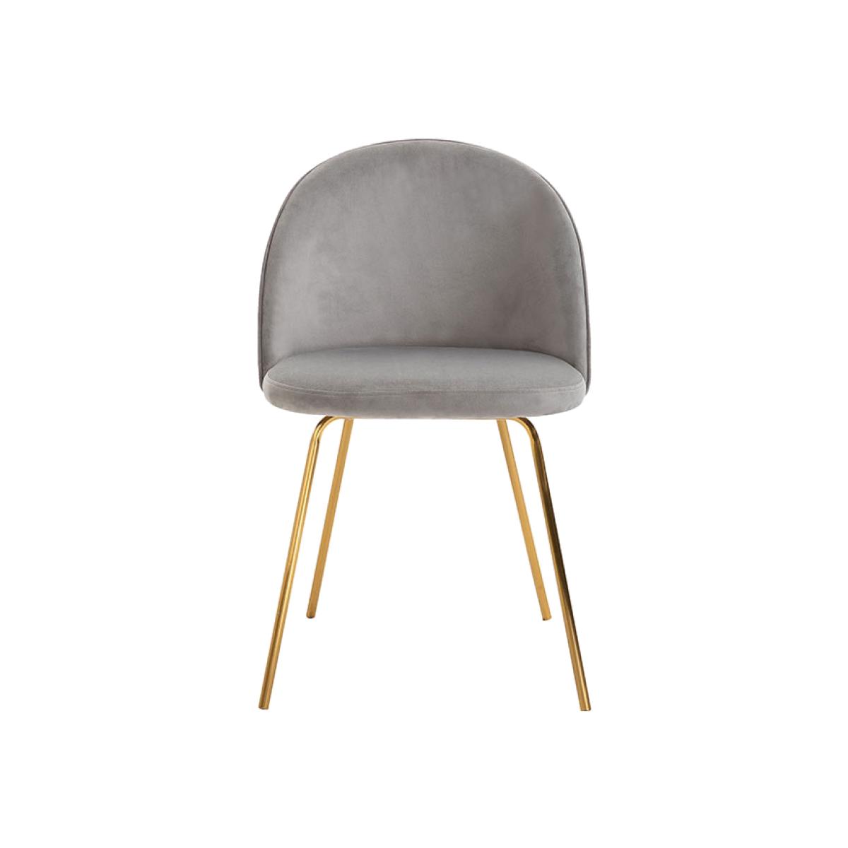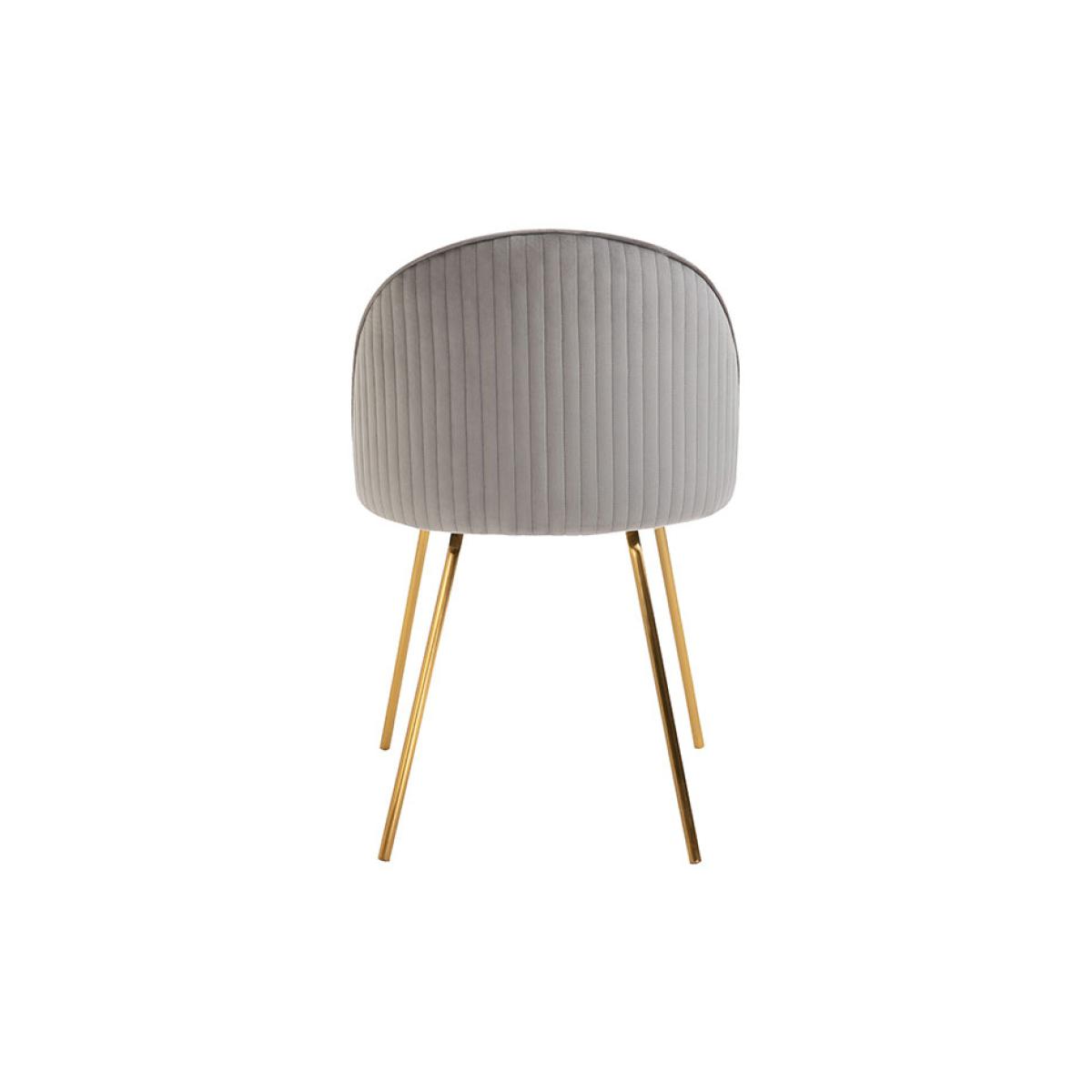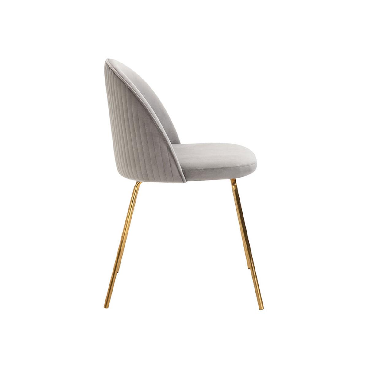 A contemporary dining chair with a subtle Art Deco influence. Fluted upholstery to back. Steel legs with brushed brass finish. Velvet fabric. Assembly required, simply attach the legs.