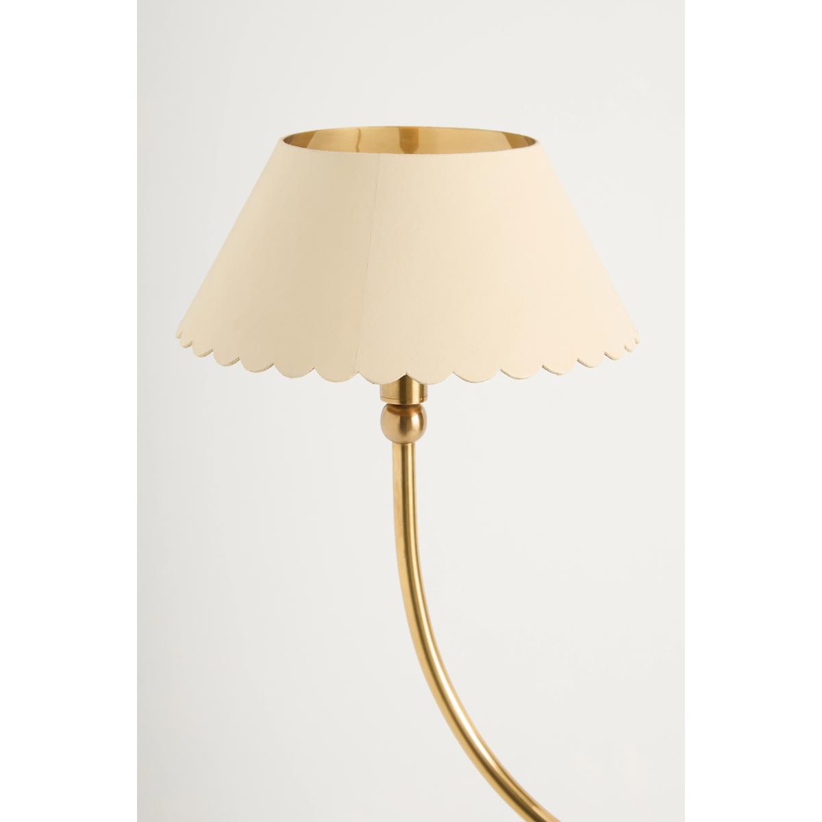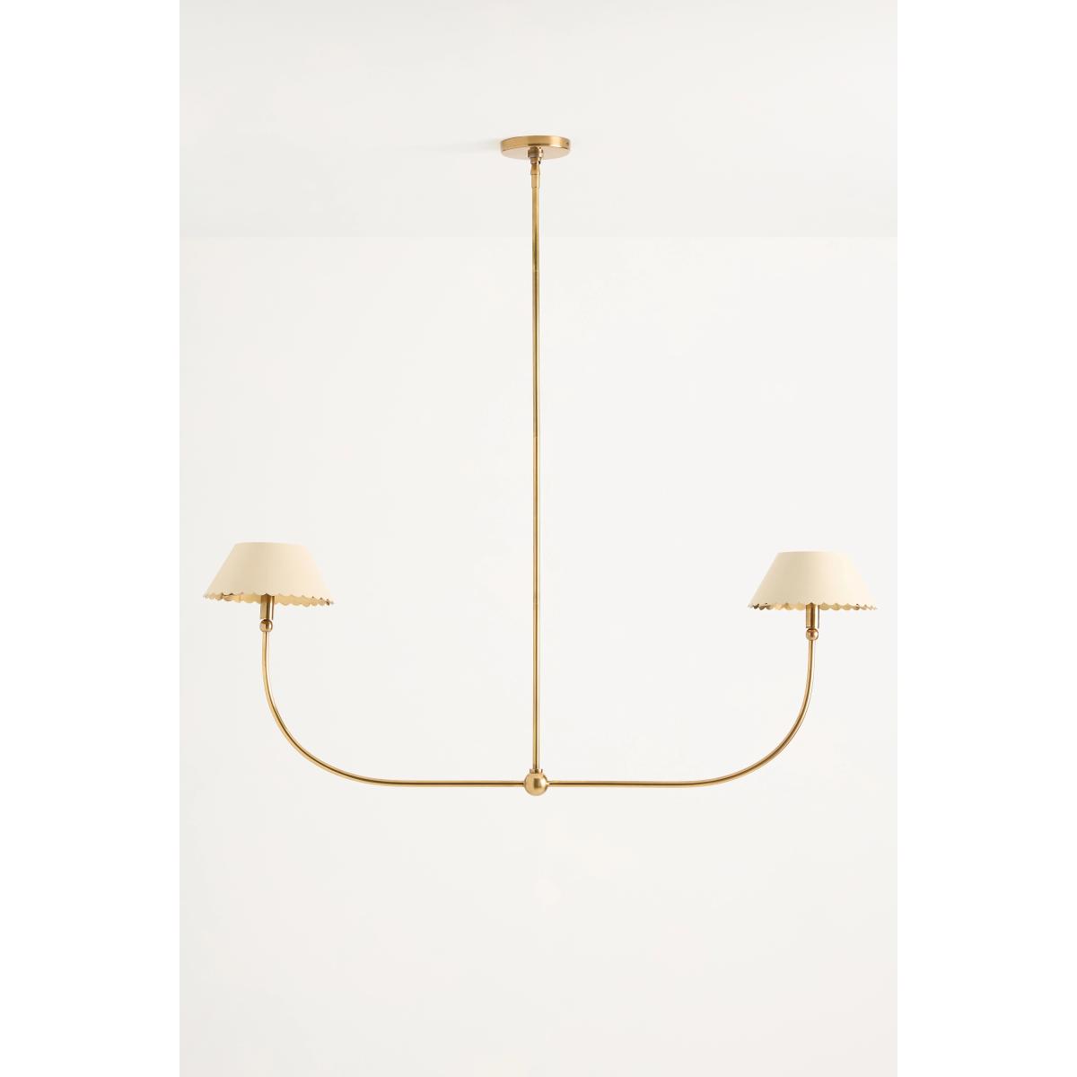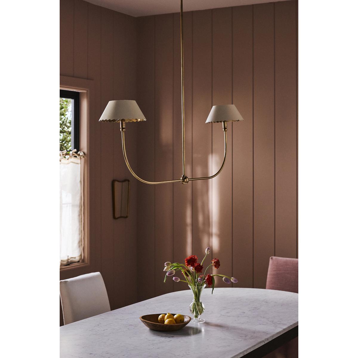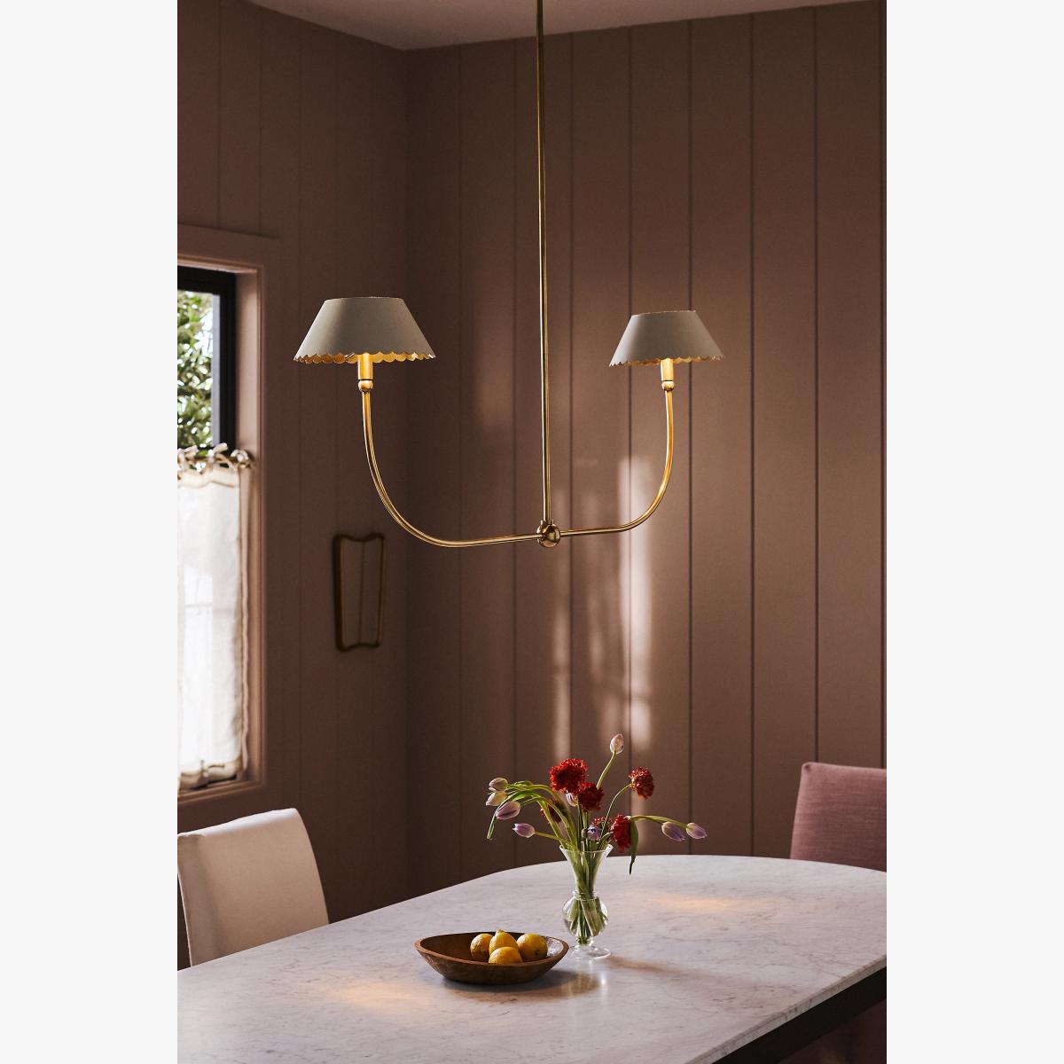 *This item is CE listed, meaning it has been tested and approved to meet the government-regulated safety standards for the UK. Use with electrical outlets of 230v or lower, as anything higher can cause fire or injury. If you're purchasing this item for use outside of the United Kingdom, employ the adapter and voltage converter suited for your country* * Brass, leather * Scalloped edges are handcrafted and subject to variance * Black SVT-3 cord * Hardwired; professional installation recommended * Cannot be installed with a dimmer * Cannot be installed on a sloped ceiling * Includes mounting plate and pole kit * Two light sockets * 25 watt max * We recommend using type E14 / G bulbs * CE listed * Imported