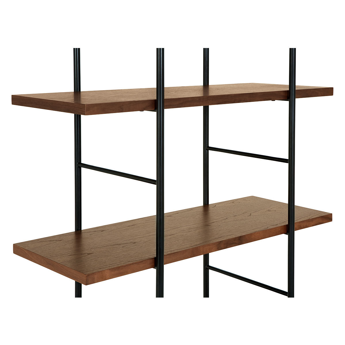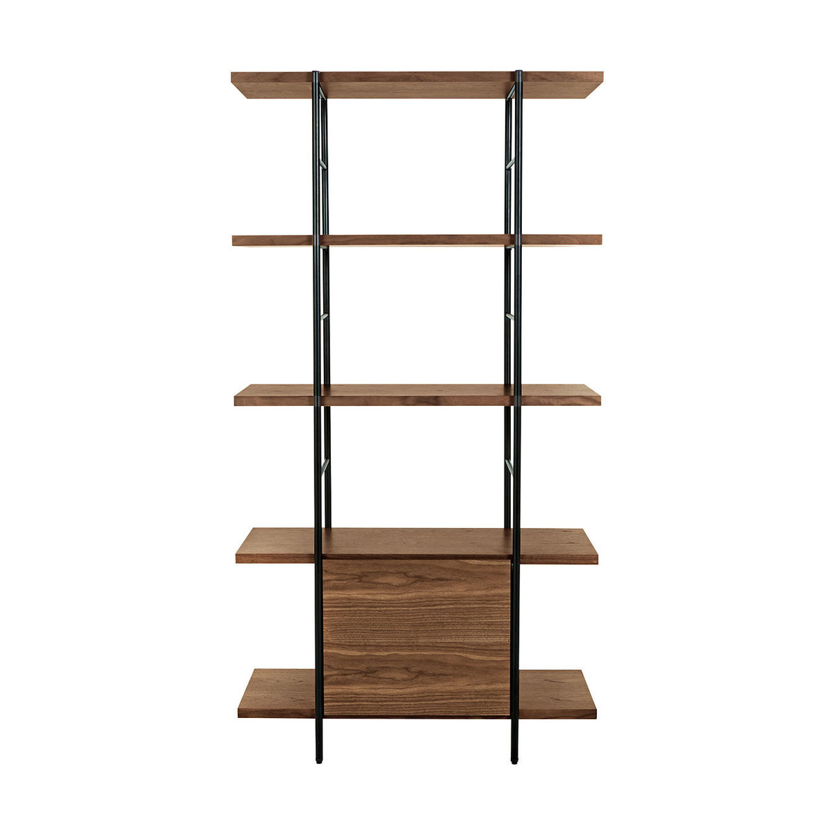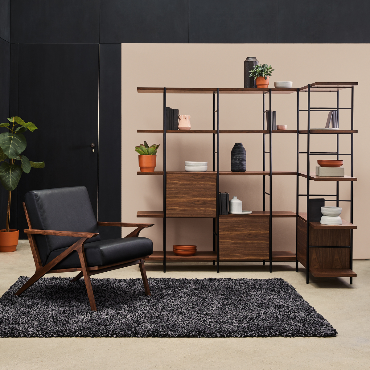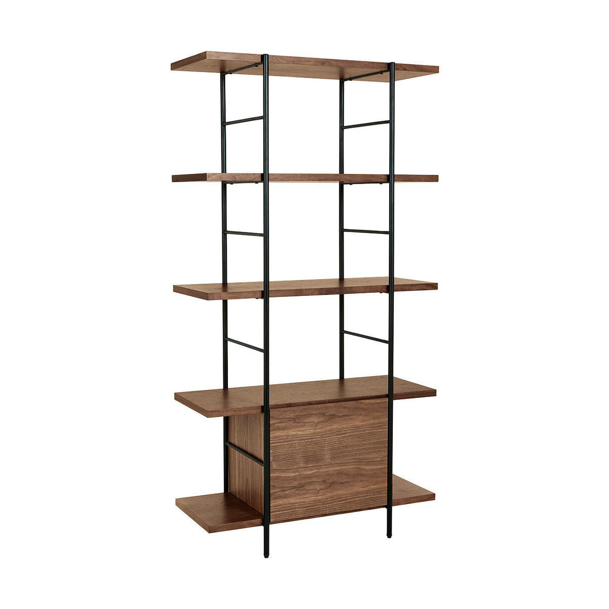 The Robertson walnut and black metal 4 shelf narrow bookcase is a sophisticated storage solution for your home. Created in the Habitat design studio and crafted from hard wearing walnut veneer, this bookcase’s 4 shelves and 2 hidden cupboards are coated and finished with a lacquer for durability. It’s supported by a powder-coated metal frame that brings a subtle industrial style finish to the design. Ideal for the living room, dining room or office, its minimalist silhouette offers a modern way of organising your accessories. A versatile design, a wide bookcase is also available to create a modular shelving unit.