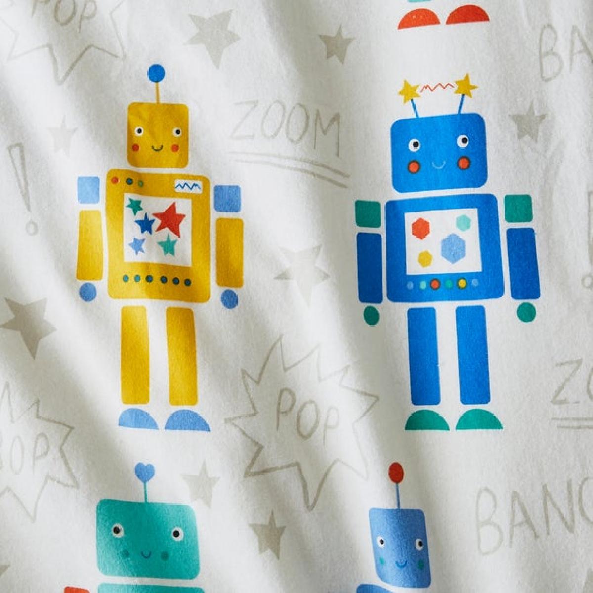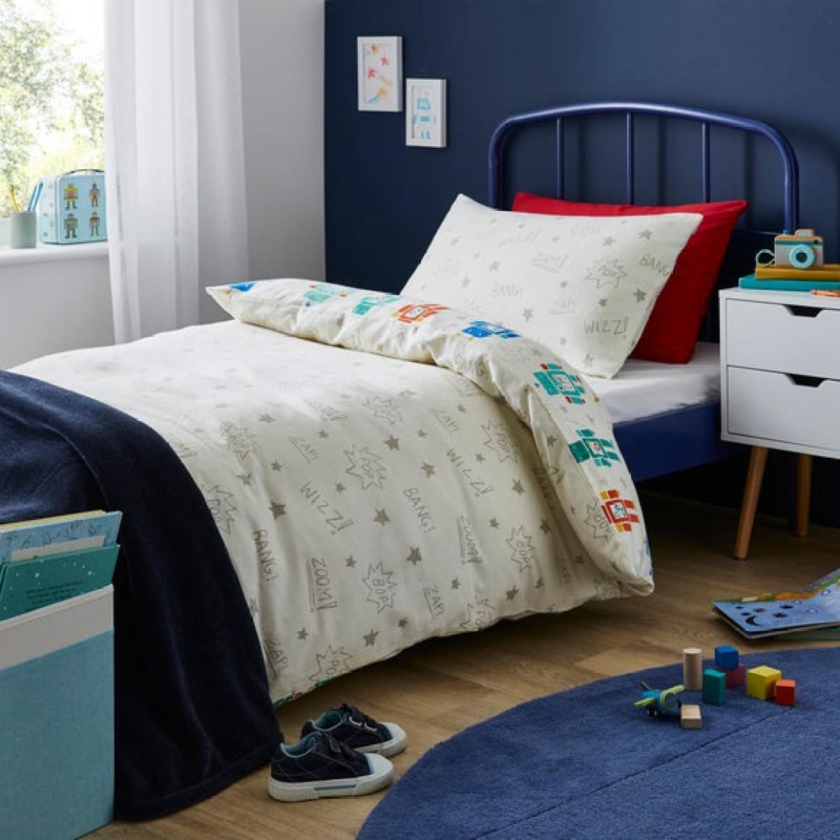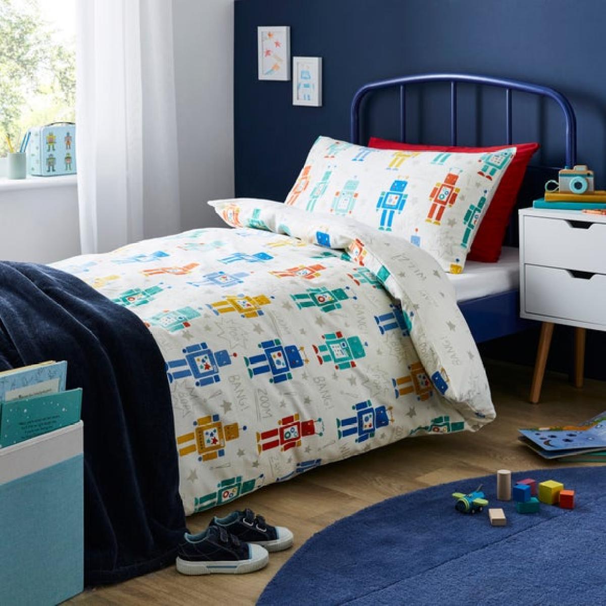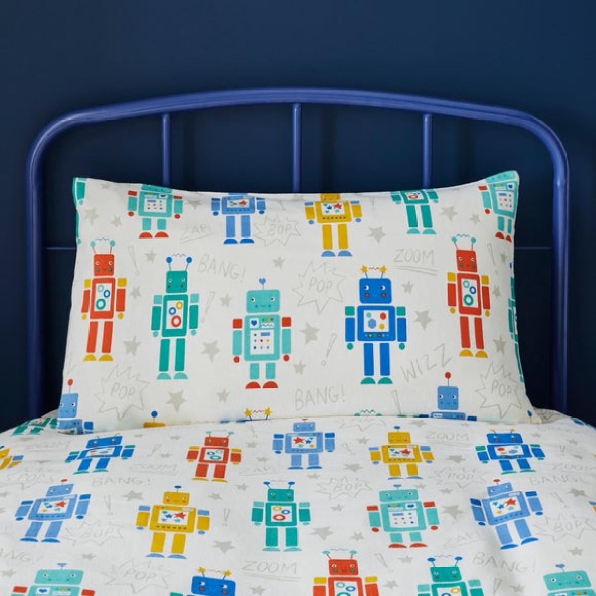 * Crafted from 100% brushed cotton * Charming retro robot design * Reversible * Available in a range of sizes Bring a touch of retro fun to bedtime with this playful robot-themed bedding, made from 100% brushed cotton for extra softness and warmth. The reversible design means double the charm, flip it over for a fresh look whenever you fancy. With it's bright, cheerful colours and nostalgic robot motifs, it's perfect for little dreamers who love all things mechanical. Available in cot bed and single bed sizes, it's designed to keep them cosy through every stage of growing up. Soft, snug and full of character, it's a brilliant way to spark imagination at bedtime. Just the thingfor robot fans with a love for quirky design.