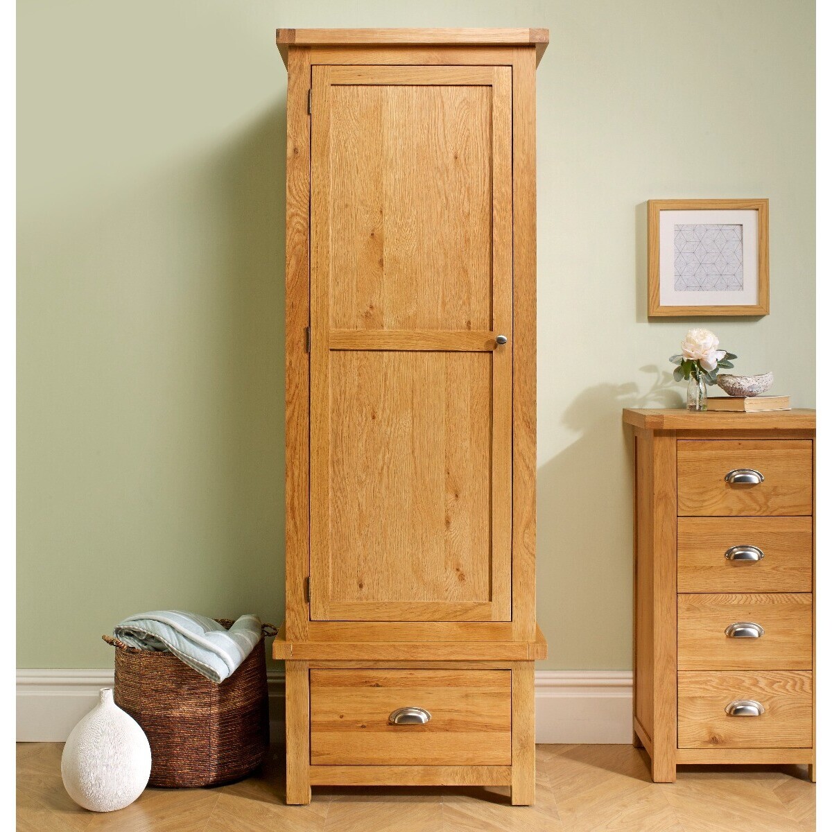 The Robyn range is a chunky, solid oak range which is built to last. The oak used has a prominent grain - ensuring that none of the rustic feel of solid oak furniture is lost. The cup style handles are simple and functional and the lack of fussiness means the Robyn range is suitable for a wide range of interiors. The one door and one drawer wardrobe scores points for style and functionality. Handy drawer for storing smaller items. Solid oak construction. Simple, hard-wearing range. Easy to assemble.