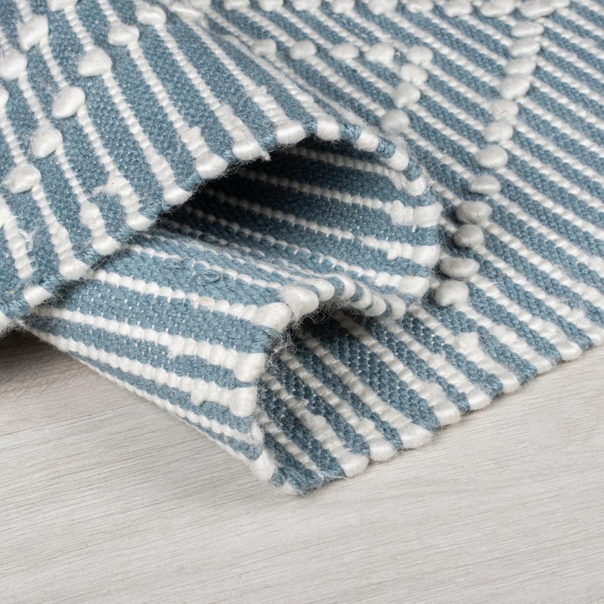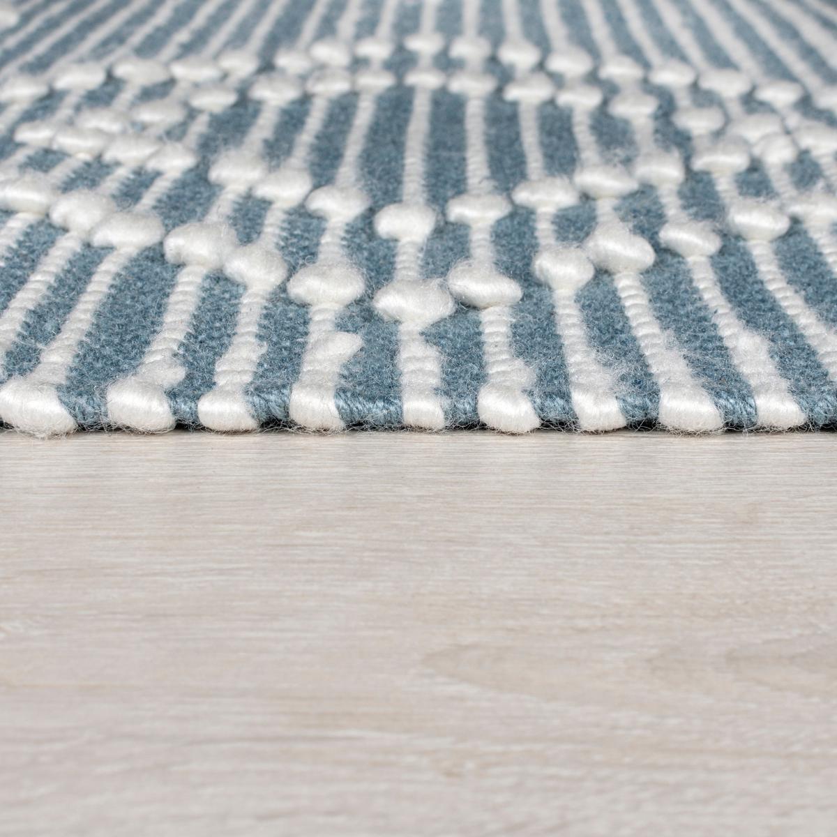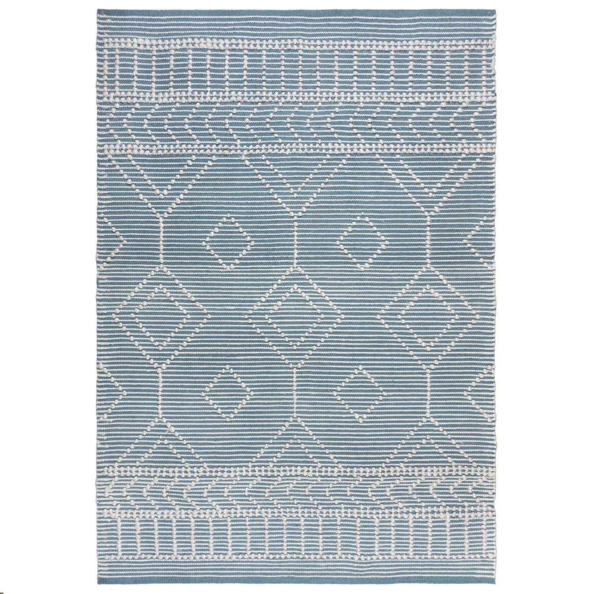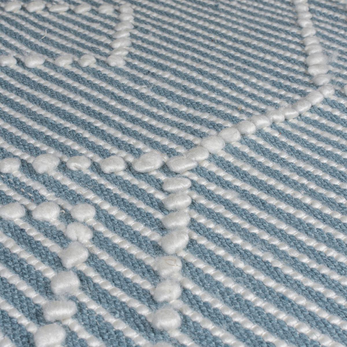 Inspired by Berber style geometrics, the Robyn rug pairs a white tufted loop pattern with a calming blue surface. Handcrafted by skilled rug artisans, the Robyn is ideal for adding a unique touch to your space. The soft, textured surface is the ideal choice for cosy indoors areas, perfect for living and dining spaces. A small amount of fibre loss is normal. Do not pull loose fibres, just trim with scissors. Safe for use on a heated floor. Use a suction type vacuum - rotating brushes may damage this rug. Re-roll your rug pile out for 24 hours to reduce curling. Regularly turn to ensure even wear. An anti-slip mat will help prevent slipping. Blot spills immediately with a clean, dry white cloth. Do not rub. Do not place this rug near an open fire. Please do not leave children or infants unattended. Avoid prolonged exposure to direct sunlight as this may cause fading of the colour.